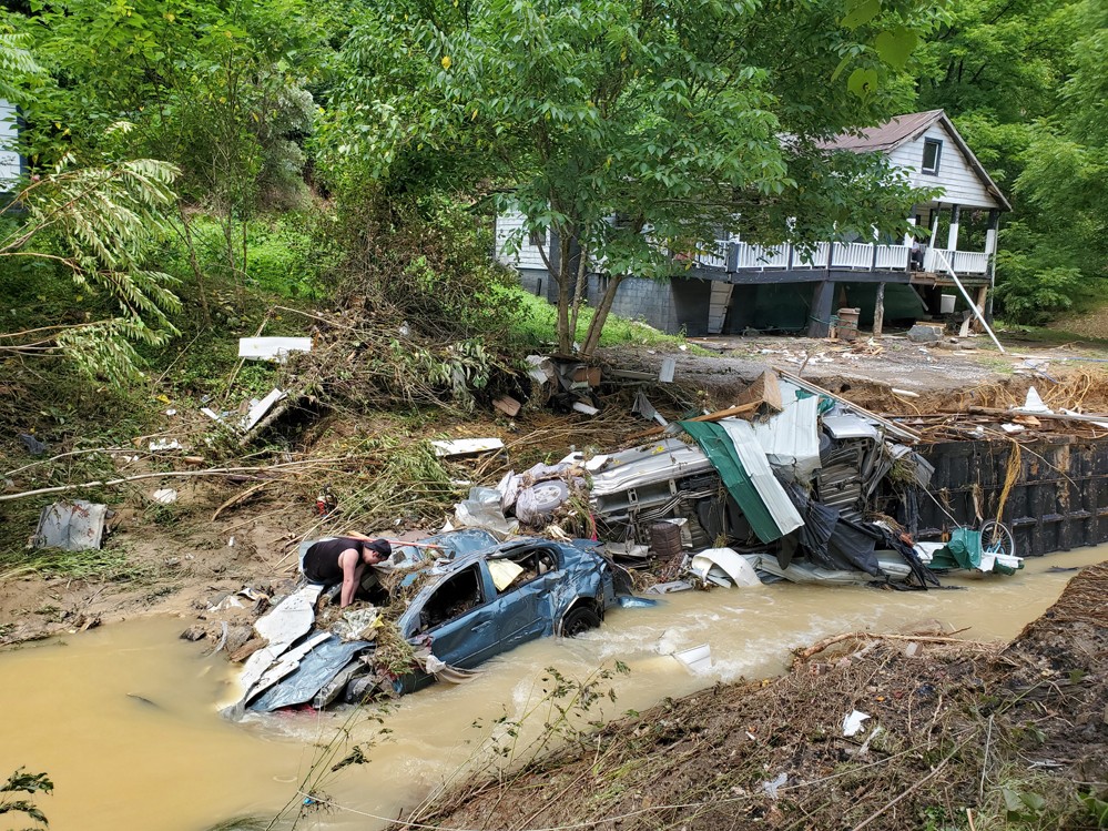 這是7月30日在美國(guó)肯塔基州東部阿巴拉契亞山區(qū)拍攝的受損的汽車與房屋。