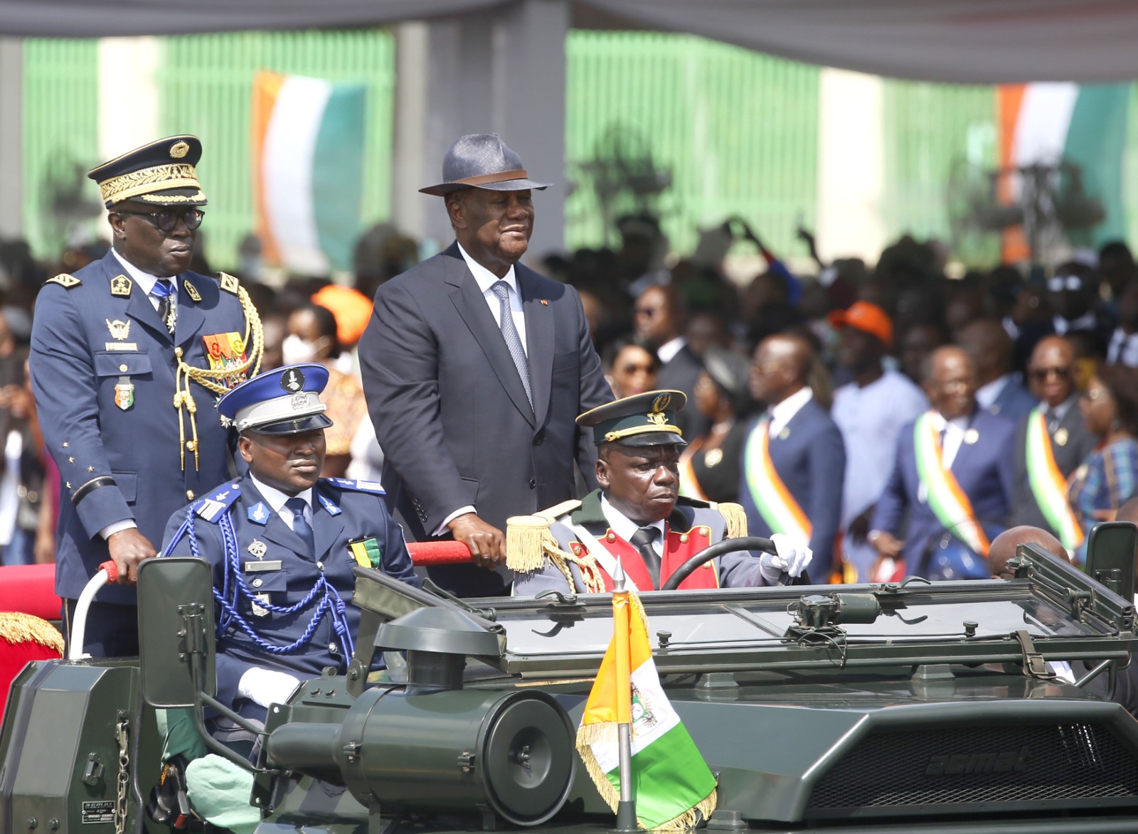 8月7日,在科特迪瓦亞穆蘇克羅,總統(tǒng)瓦塔拉(左三)出席獨立日閱兵儀式。