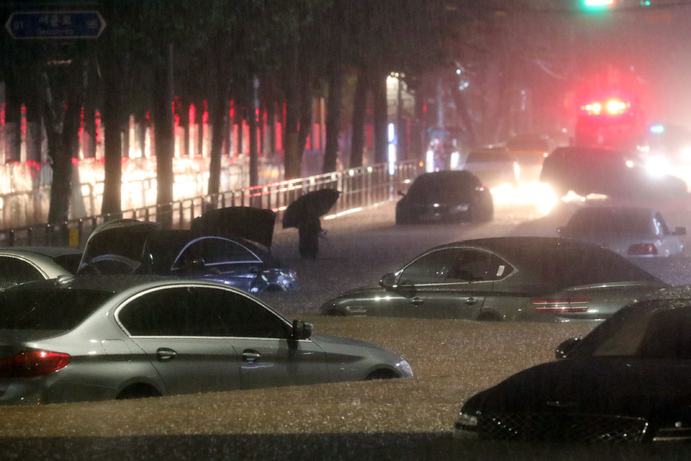 8月8日,在韓國(guó)首爾江南區(qū),汽車被困在積水的道路上。