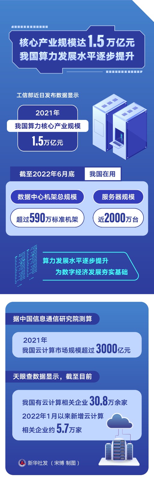 工信部近日發(fā)布數(shù)據(jù)顯示,2021年,我國算力核心產(chǎn)業(yè)規(guī)模達(dá)1.5萬億元。截至2022年6月底,我國在用數(shù)據(jù)中心機架總規(guī)模超過590萬標(biāo)準(zhǔn)機架,服務(wù)器規(guī)模近2000萬臺。算力發(fā)展水平逐步提升,為數(shù)字經(jīng)濟(jì)發(fā)展夯實基礎(chǔ)。