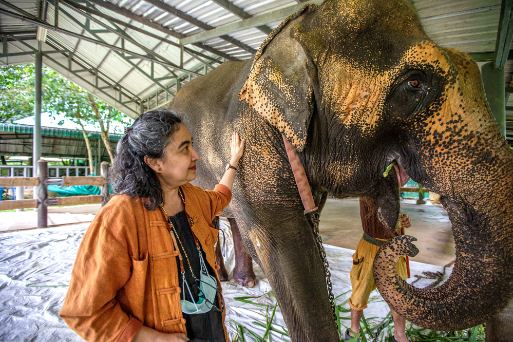8月6日,在泰國(guó)南邦府“亞洲象之友”大象醫(yī)院,蘇賴達(dá)·薩瓦拉看望一頭受傷的大象。