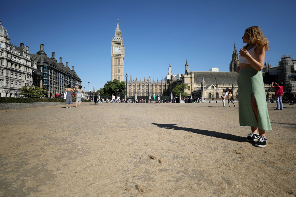 8月13日,在英國倫敦議會廣場,一名女子站在枯黃的草地上。