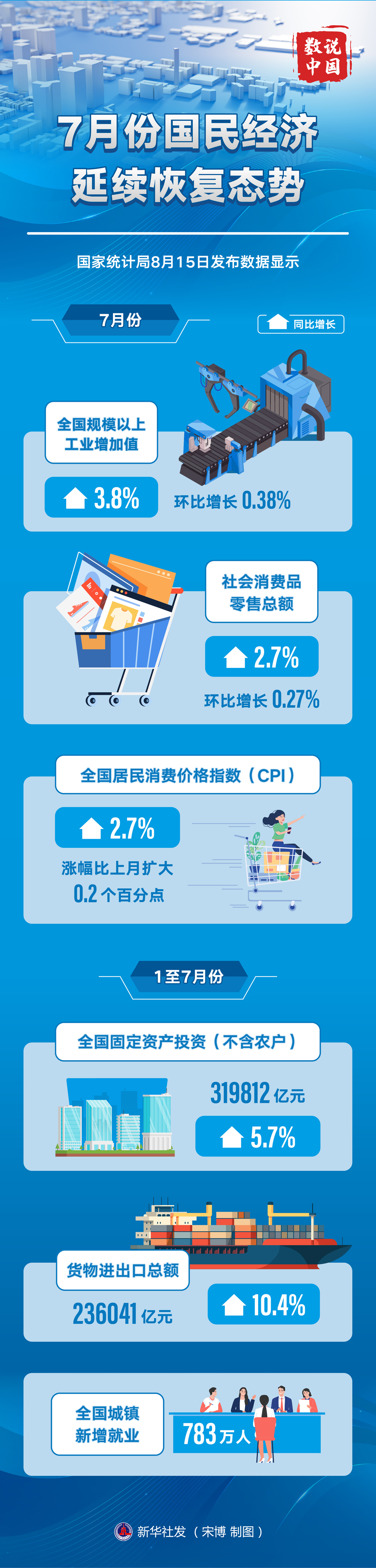 國家統(tǒng)計局8月15日發(fā)布數據顯示,7月份,生產供給繼續(xù)恢復,就業(yè)物價總體平穩(wěn),對外貿易增勢良好,民生保障有力有效,國民經濟延續(xù)恢復態(tài)勢。