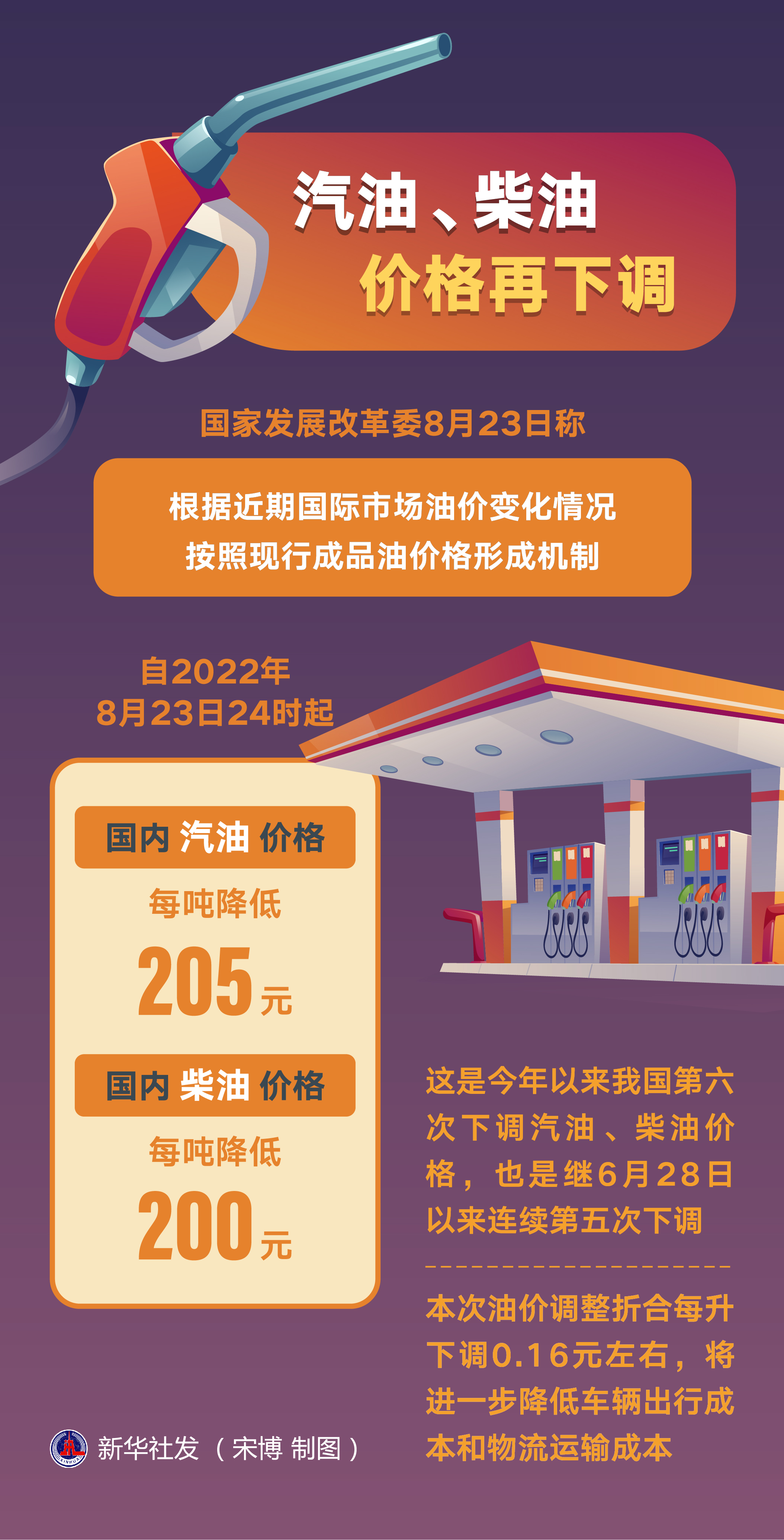 國家發(fā)展改革委8月23日稱,根據(jù)近期國際市場油價變化情況,按照現(xiàn)行成品油價格形成機制,自2022年8月23日24時起,國內汽油、柴油價格每噸分別降低205元和200元。