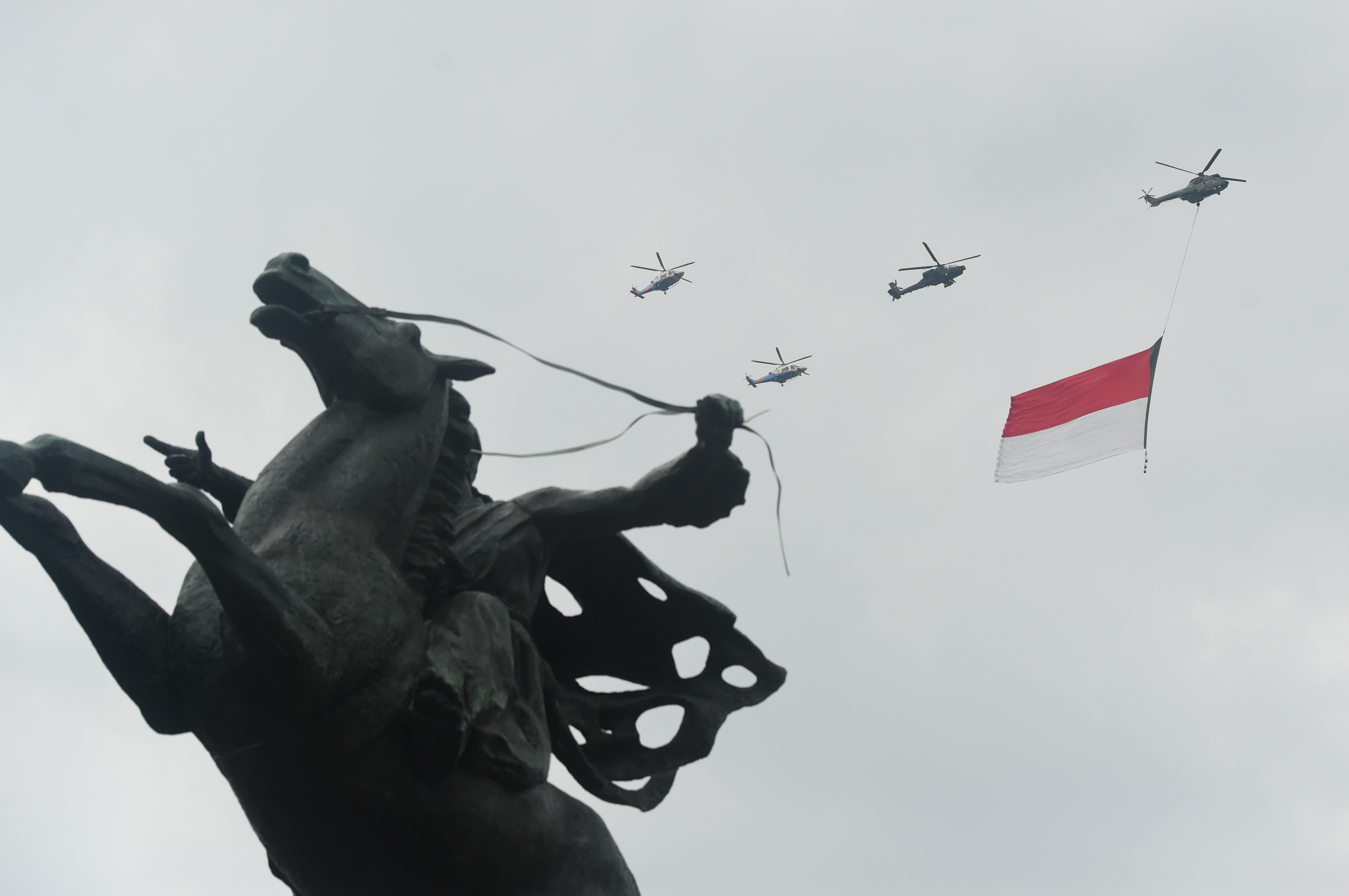 8月17日,懸掛印度尼西亞國旗的飛機(jī)編隊飛過首都雅加達(dá)上空。