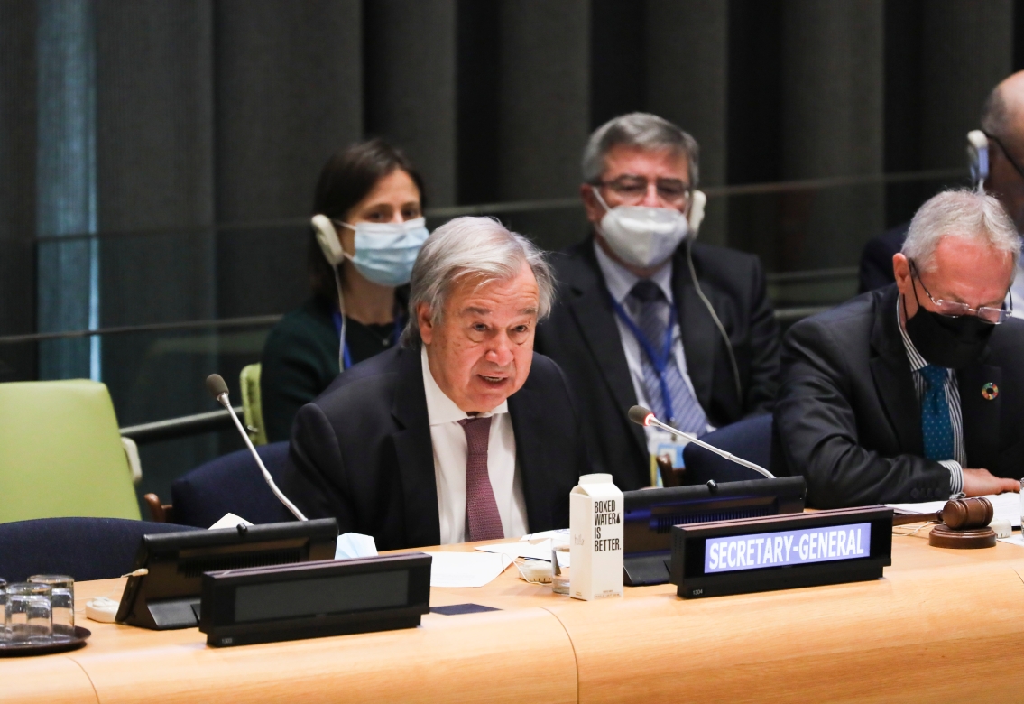 9月26日,在位于紐約的聯(lián)合國總部,聯(lián)合國秘書長古特雷斯(前左)在紀(jì)念“徹底消除核武器國際日”高級別會議上致辭。聯(lián)合國大會26日舉行紀(jì)念“徹底消除核武器國際日”高級別會議,聯(lián)合國秘書長古特雷斯在致辭中敦促采取一切手段消除核威脅。