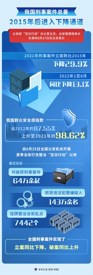 公安部“百日行動(dòng)”辦公室主任、治安管理局局長仇保利9月27日在北京表示,2021年刑事案件立案數(shù)比2015年下降29.9%,今年1至8月同比又下降13.1%;我國群眾安全感指數(shù)由2012年的87.55%上升至2021年的98.62%。