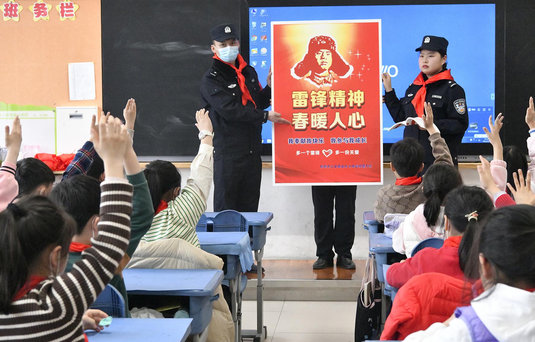 3月2日,河南省鄭州市公安局金水分局巡特警隊(duì)員在實(shí)驗(yàn)小學(xué)開展“雷鋒精神 春暖校園”活動(dòng)。
