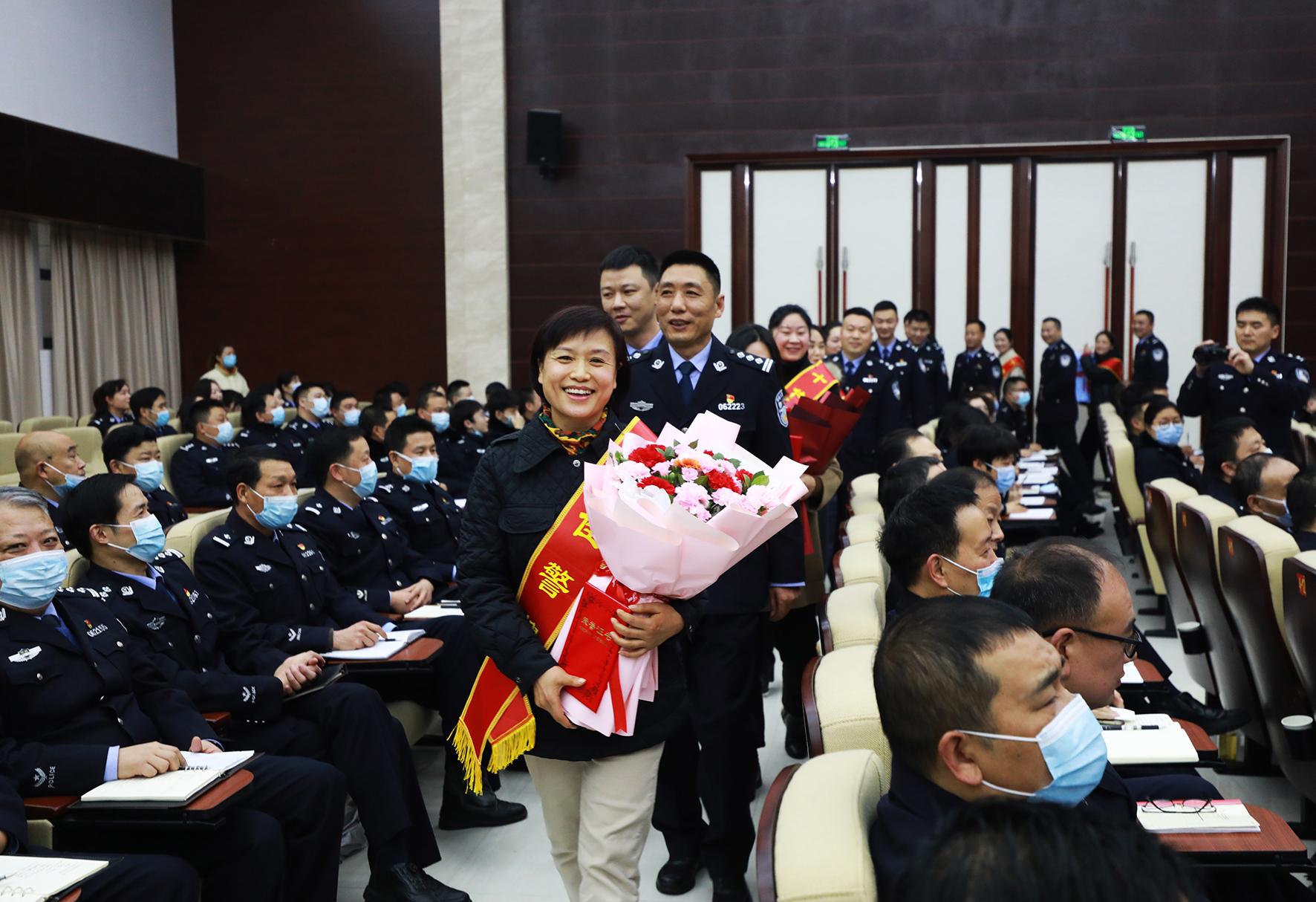 2月8日,在湖北省秭歸縣公安局表彰優(yōu)秀警嫂的現(xiàn)場,10名民警突然上演了一場”早有預(yù)謀”的浪漫演出,為當(dāng)選優(yōu)秀警嫂的妻子送上充滿愛意與感激的鮮花,一起并肩走上領(lǐng)獎(jiǎng)臺。