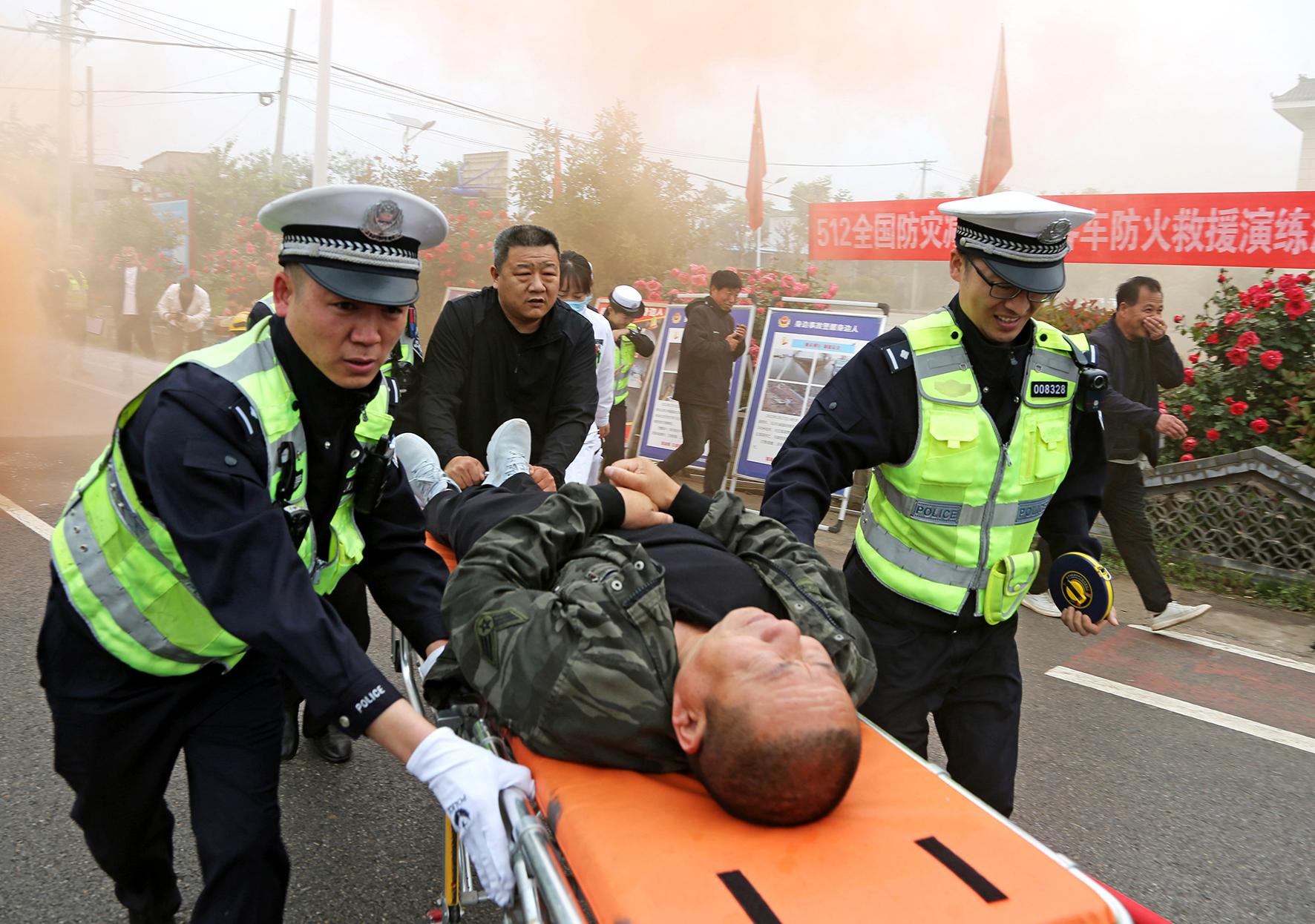 5月10日,陜西省渭南市公安局交警支隊(duì)臨渭大隊(duì)聯(lián)合消防、衛(wèi)生等部門開展客車滅火救援演練。