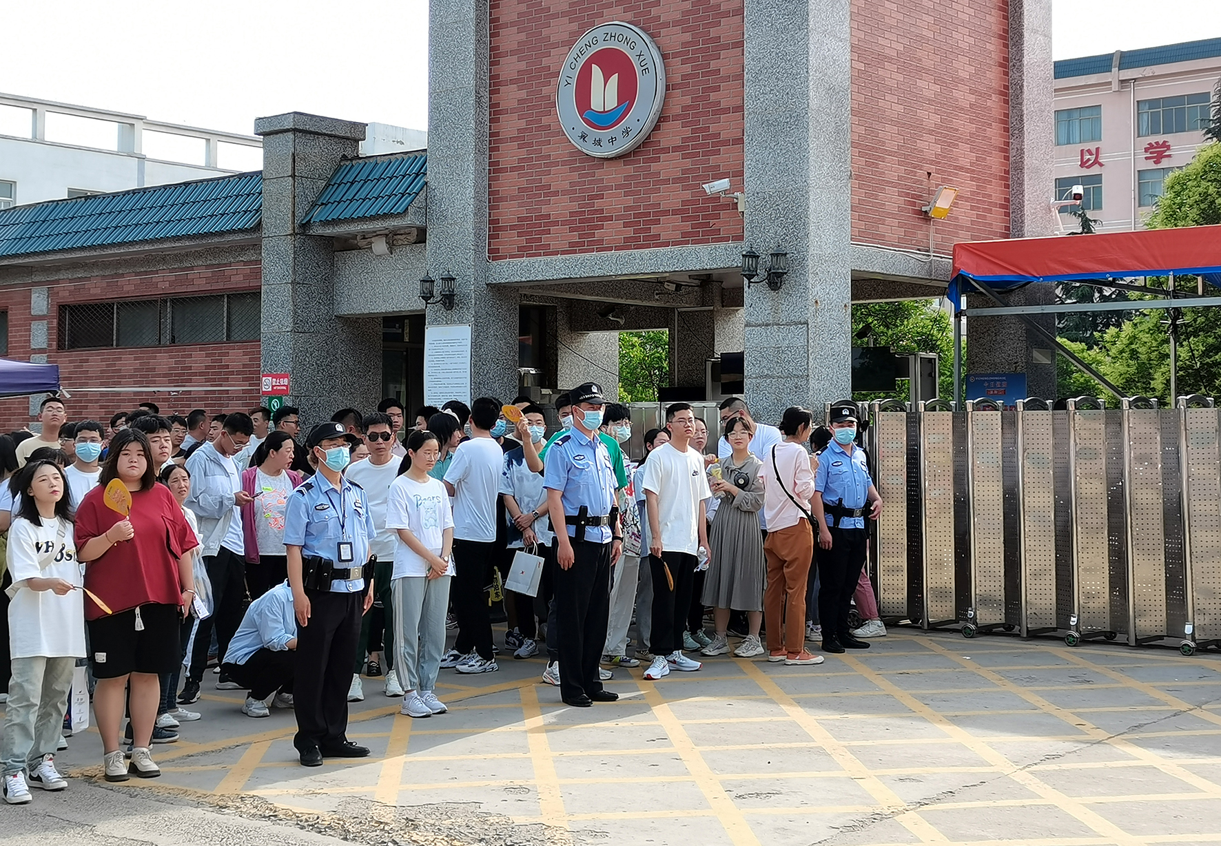 6月7日,河南省鄭州市公安局金水分局巡特警隊(duì)員及轄區(qū)派出所民輔警在考場(chǎng)入口處護(hù)航高考服務(wù)考生和家長(zhǎng)。