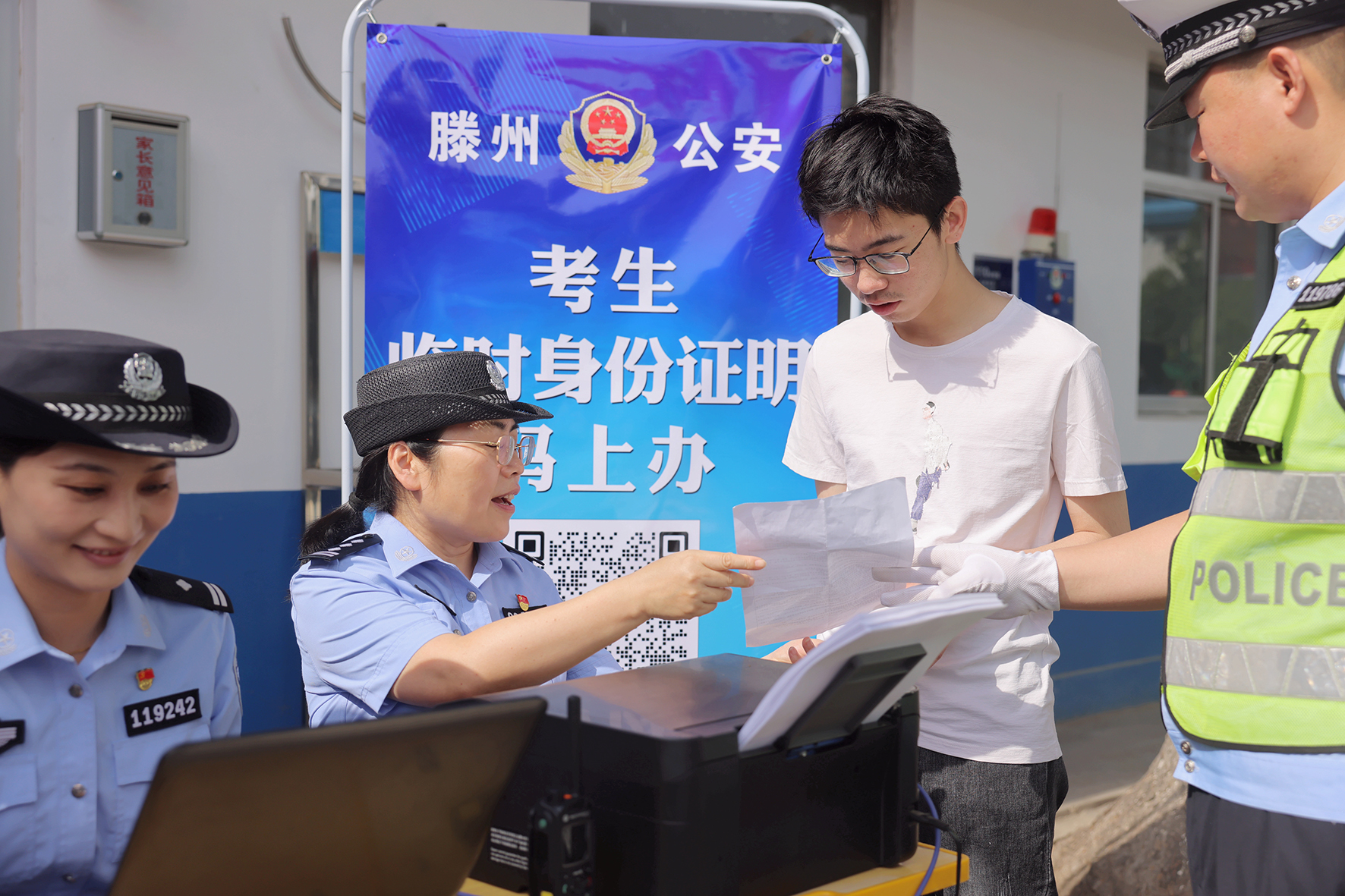 6月7日,山東省滕州市公安局民警為考試前居民身份證丟失、損壞的考生,開(kāi)辟高考“綠色通道”,提供身份信息核實(shí)、出具臨時(shí)身份證明服務(wù)。