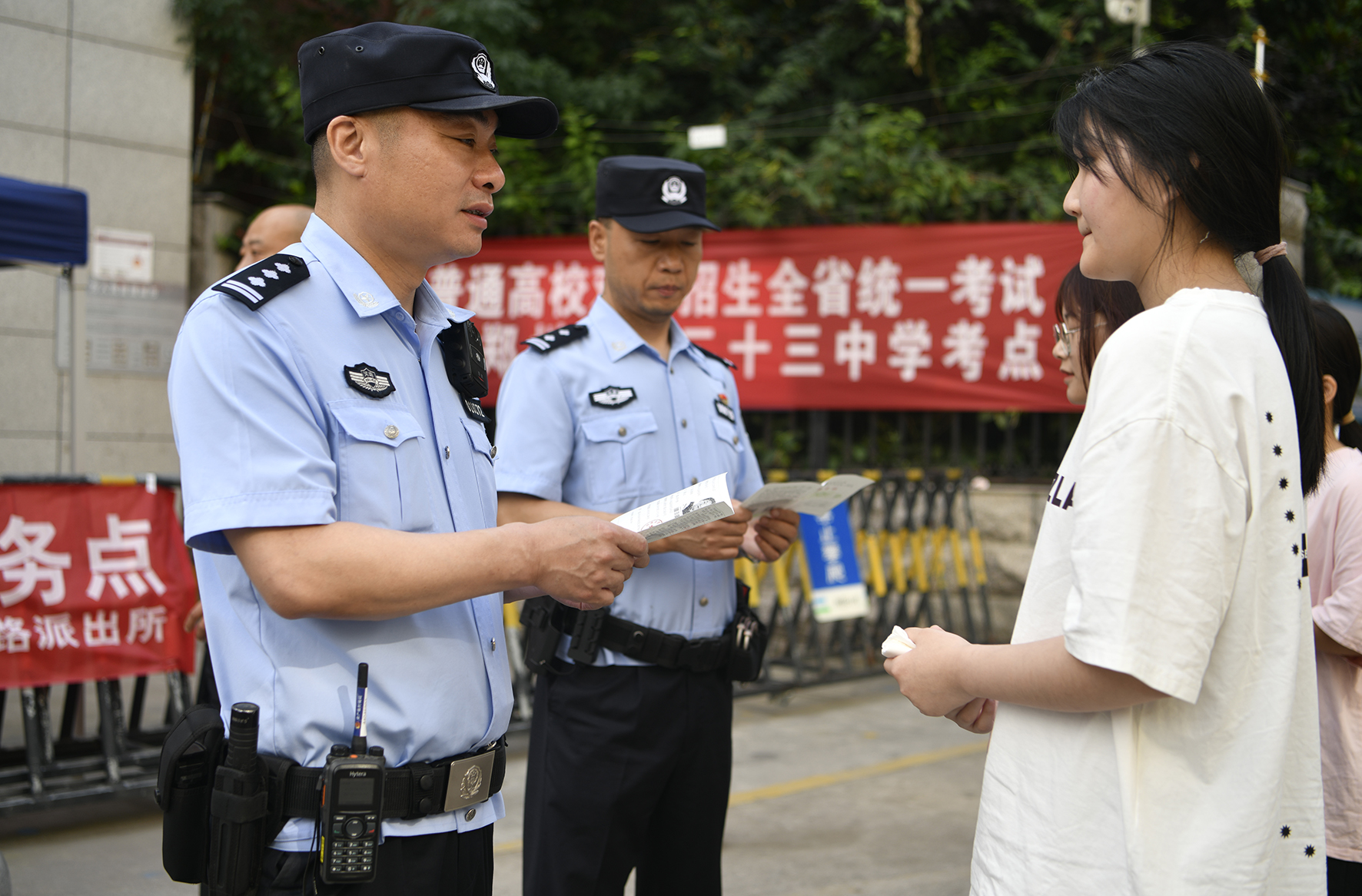 6月7日,貴州省赤水市公安局民警在第三中學(xué)考點(diǎn)現(xiàn)場(chǎng)維持秩序。