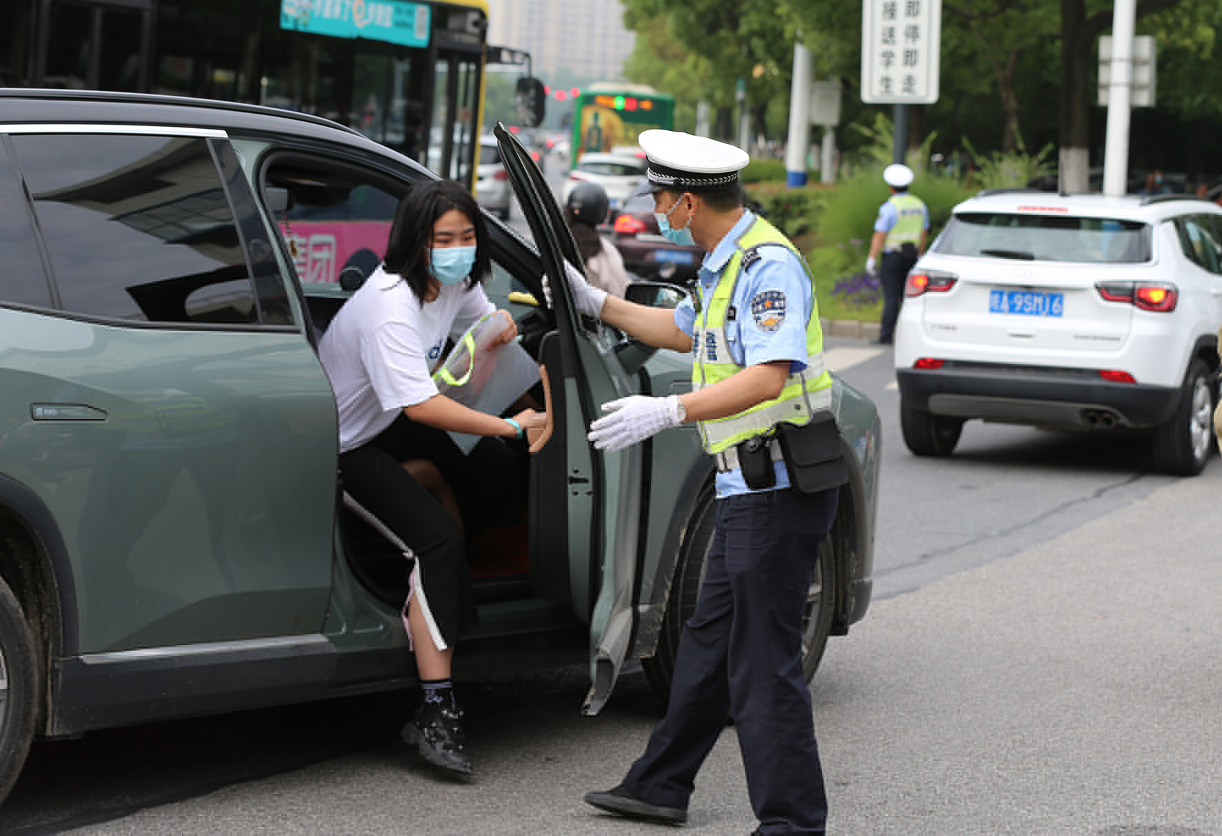 6月7日,安徽省合肥市公安局交警支隊(duì)民警在第八中學(xué)考點(diǎn)引導(dǎo)送考車(chē)輛,同時(shí)為考生及家長(zhǎng)提供便民服務(wù)。
