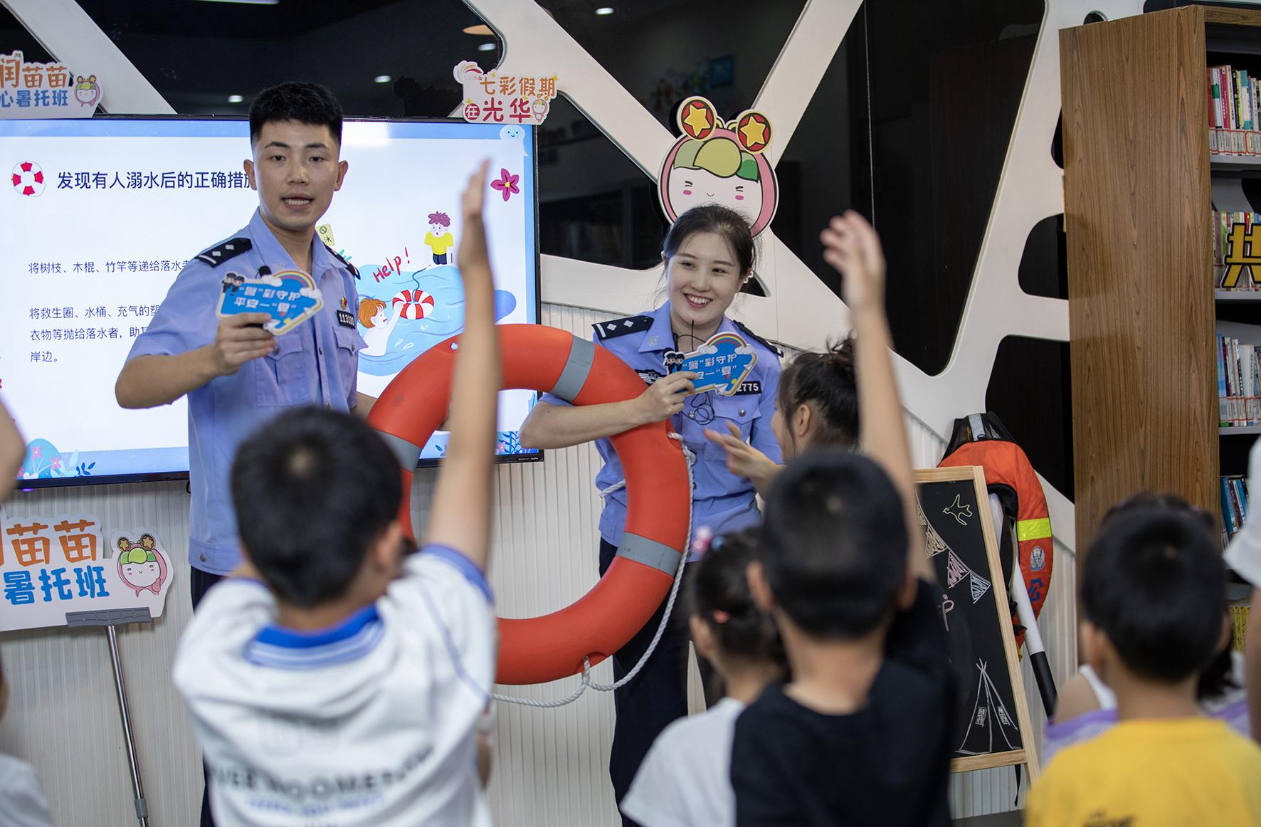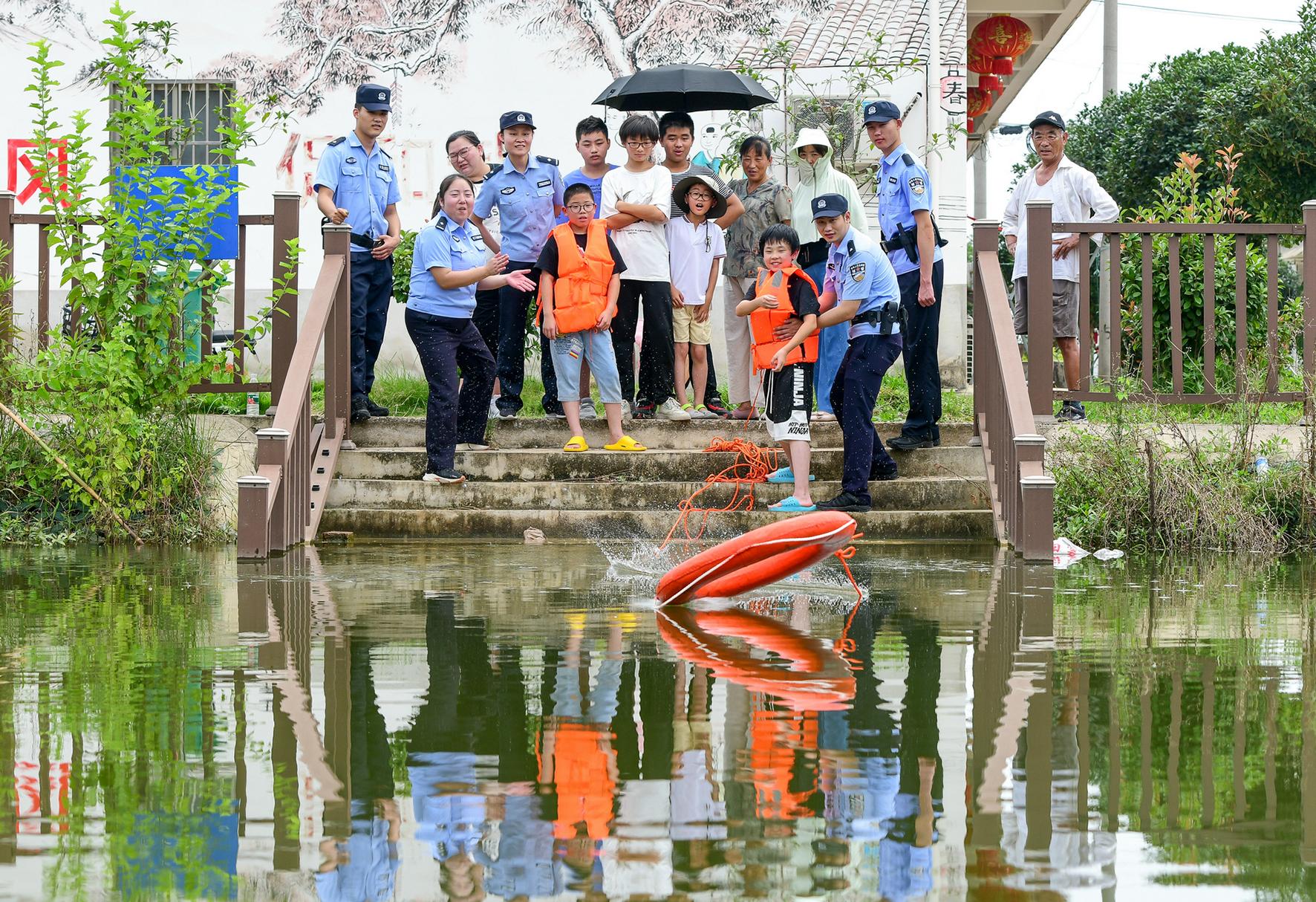 7月6日,安徽省馬鞍山市和縣公安局石楊派出所民警正在石楊鎮(zhèn)幸福村向留守兒童講解暑期防溺水知識,以提高他們知危險、會避險的意識和自我保護能力。