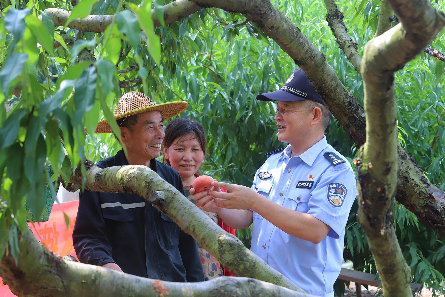 7月18日,浙江省臺州市路橋區(qū)螺洋街道上寺前村,螺洋派出所民警在蟠桃園區(qū)向果農(nóng)宣傳防范電信網(wǎng)絡(luò)詐騙知識。
