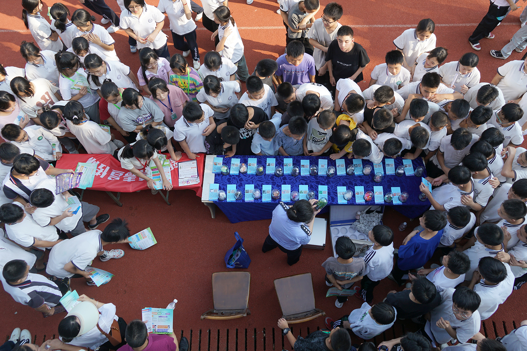 9月4日,重慶市涪陵強(qiáng)制隔離戒毒所民警在武隆區(qū)平橋中學(xué)秋期開學(xué)典禮上開展禁毒宣傳。
