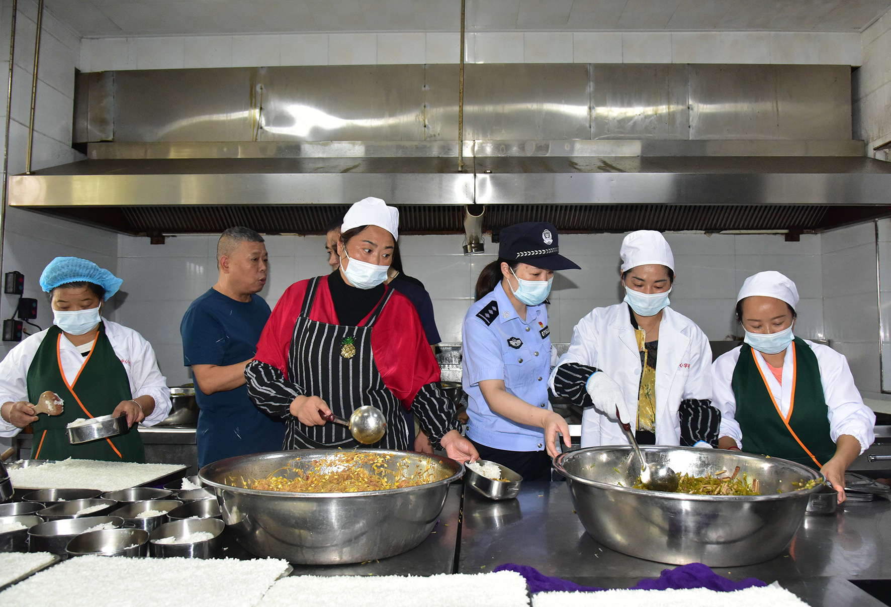 9月4日,安徽省當(dāng)涂縣公安局護(hù)河派出所民警聯(lián)合市場(chǎng)監(jiān)督管理局工作人員檢查食堂食品安全情況。