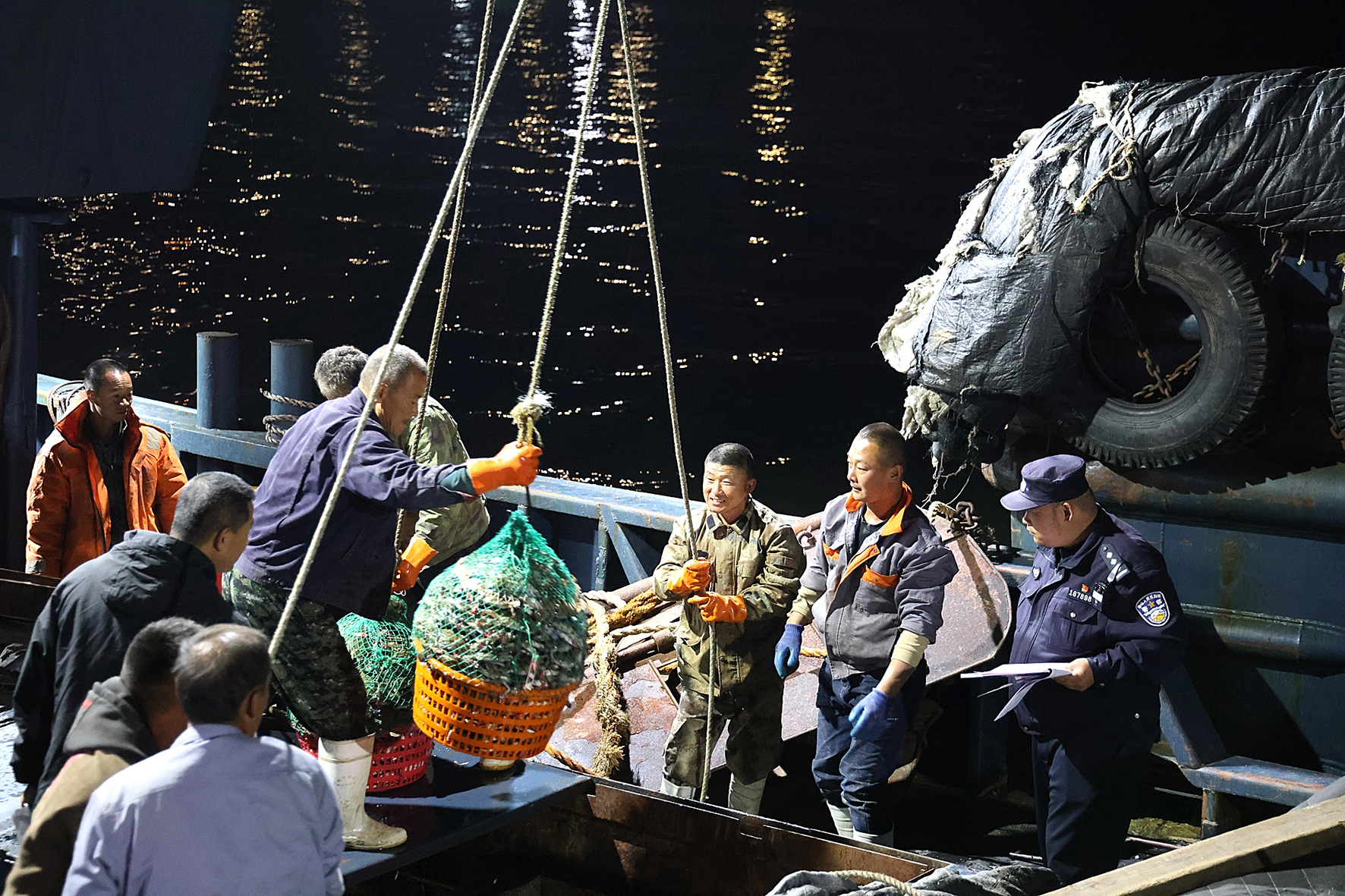 10月6日,遼寧丹東邊境管理支隊新溝邊境派出所民警對漁船出海捕撈的海產(chǎn)品進(jìn)行報備清點(diǎn)核查。