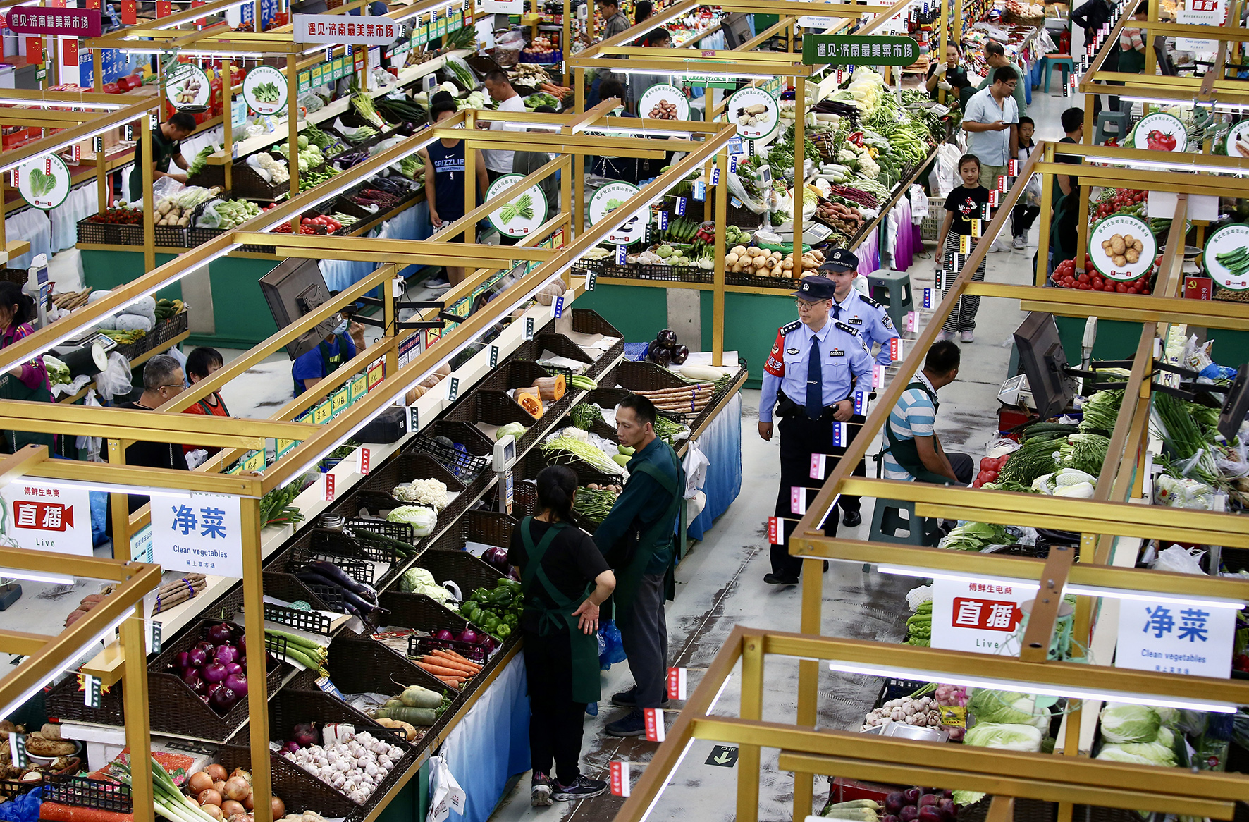 10月1日,山東省濟(jì)南市公安局市中區(qū)分局七里山派出所民警在郎茂山農(nóng)產(chǎn)品市場巡邏。