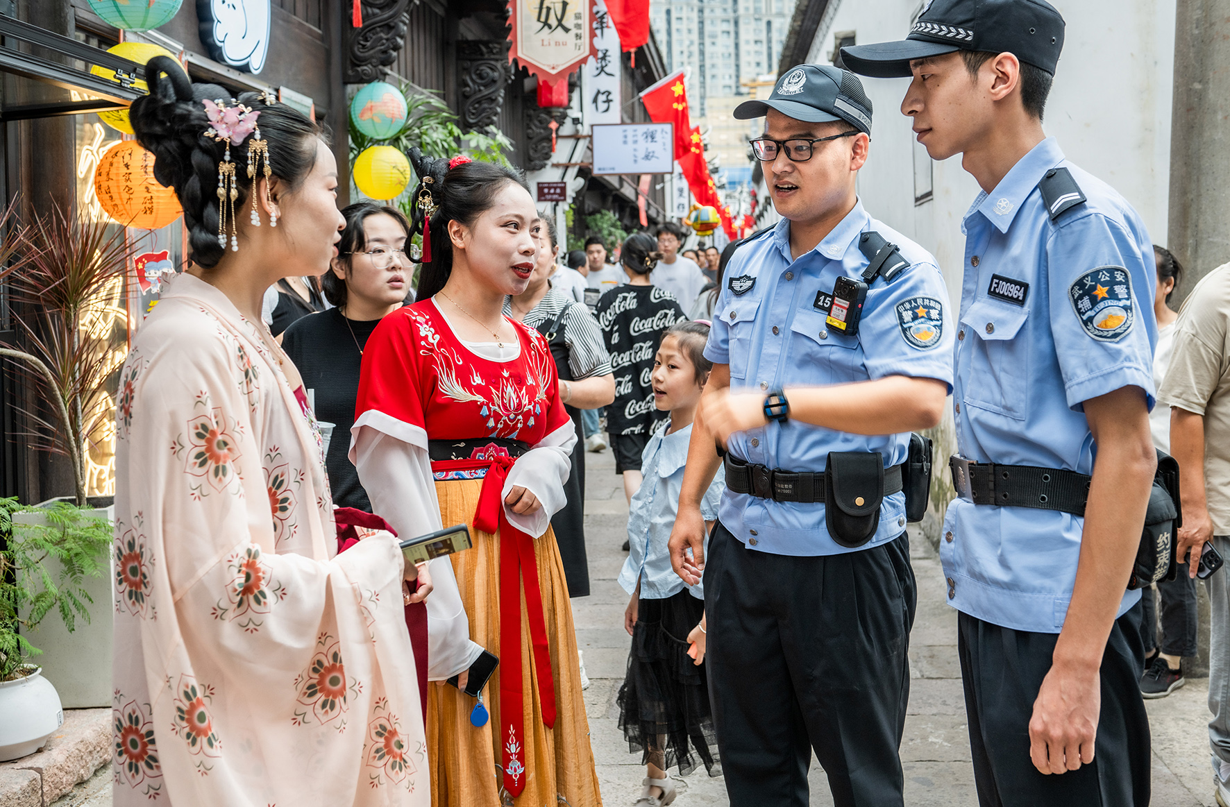 10月1日,浙江省武義縣公安局壺山派出所民警在人員密集的縣城古街進(jìn)行治安巡邏。