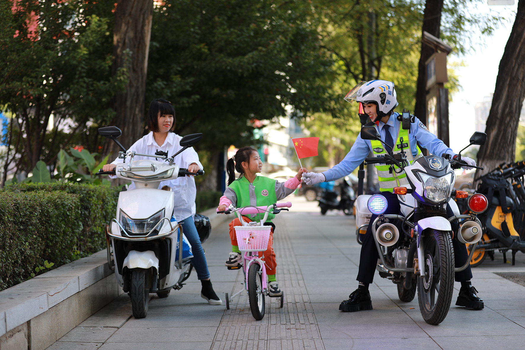 10月5日,遼寧省阜新市公安局交警支隊海州大隊女子騎警隊民警加強(qiáng)節(jié)日執(zhí)勤,叮囑小朋友注意騎行安全。