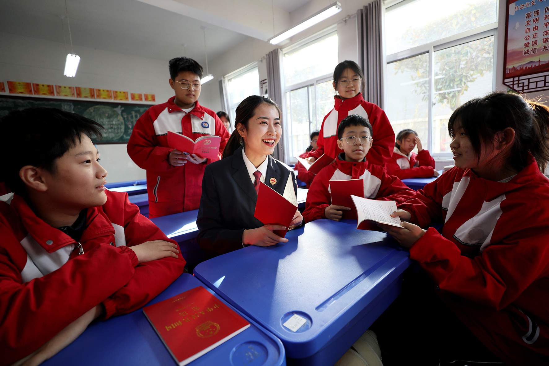 12月1日,山東省棗莊市臺兒莊區(qū)人民檢察院檢察官、法治副校長種詩雨在給古城學(xué)校的學(xué)生們普及憲法和法律知識。