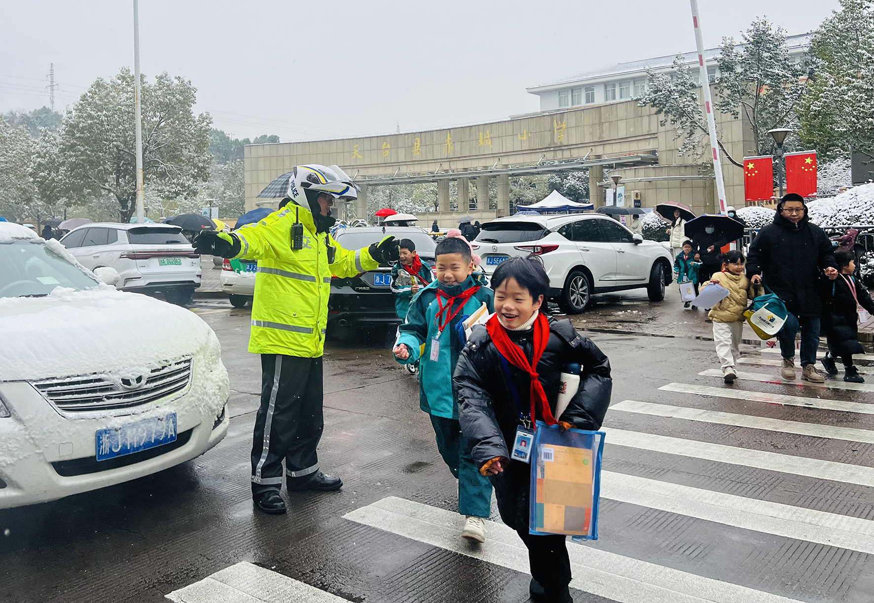 1月22日,浙江省臺州市天臺縣城區(qū)迎來入冬后首場降雪。天臺縣公安局交通警察大隊(duì)迅速開啟“護(hù)學(xué)模式”,增派護(hù)學(xué)崗警力,全力疏通上學(xué)高峰期交通秩序,保障師生出行安全。