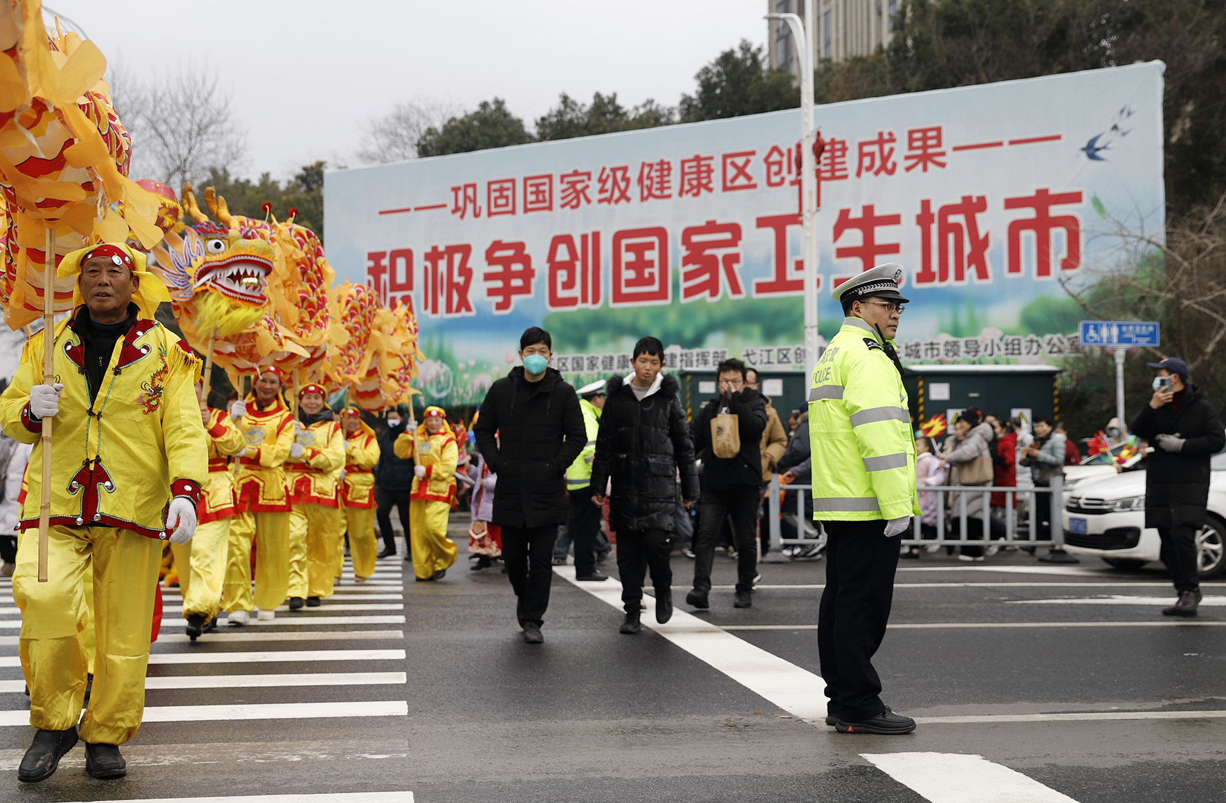 2月24日,安徽省蕪湖市舉行“龍騰盛世 福滿江城”元宵節(jié)傳統(tǒng)民俗巡游活動,蕪湖市公安局交警支隊全警上崗,服務市民,守護市民平安過節(jié)。