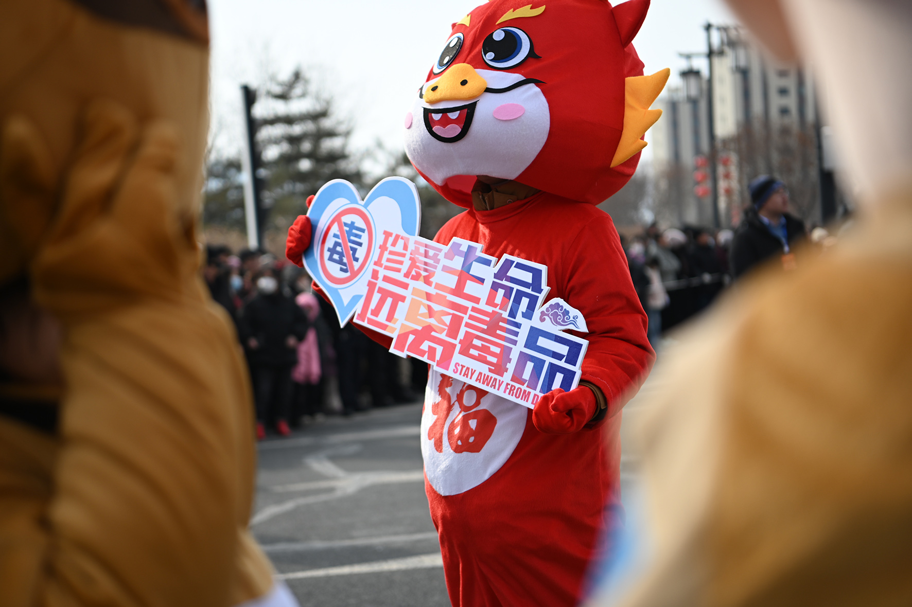 2月24日,山西省大同市廣靈縣元宵節(jié)文藝活動表演現(xiàn)場,禁毒宣傳志愿者在開展禁毒知識宣傳。