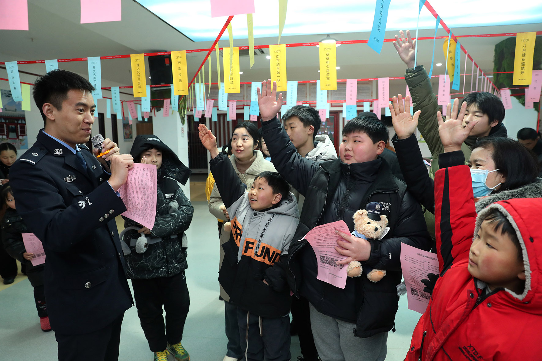 2月24日,安徽省蒙城縣“慶新春 鬧元宵”有獎猜謎活動現(xiàn)場,民警向家長和孩子們介紹燈謎游戲中的反詐知識。