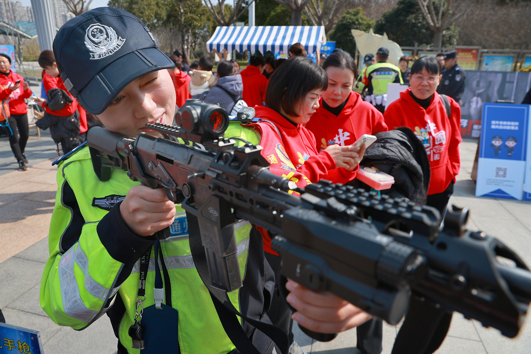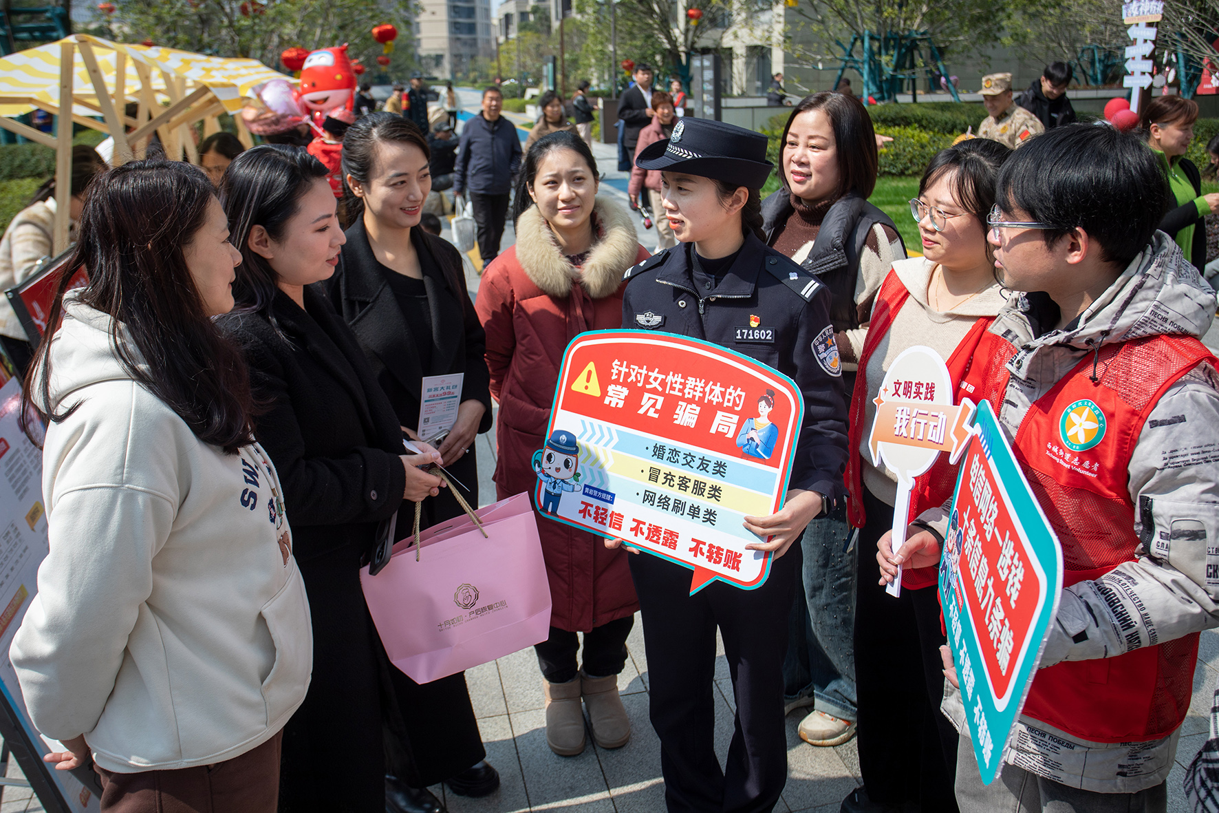 3月7日,浙江省臺州市公安局黃巖分局城西派出所女民警在迎“三八”活動現場開展安全防范宣傳。