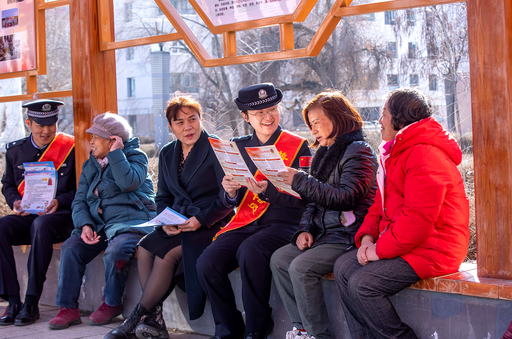 3月7日,湖北省荊門市公安局巡特警支隊蘇畈橋警務站女民警在沿河社區(qū),向居民普及婦女、兒童權益保護相關法律知識。