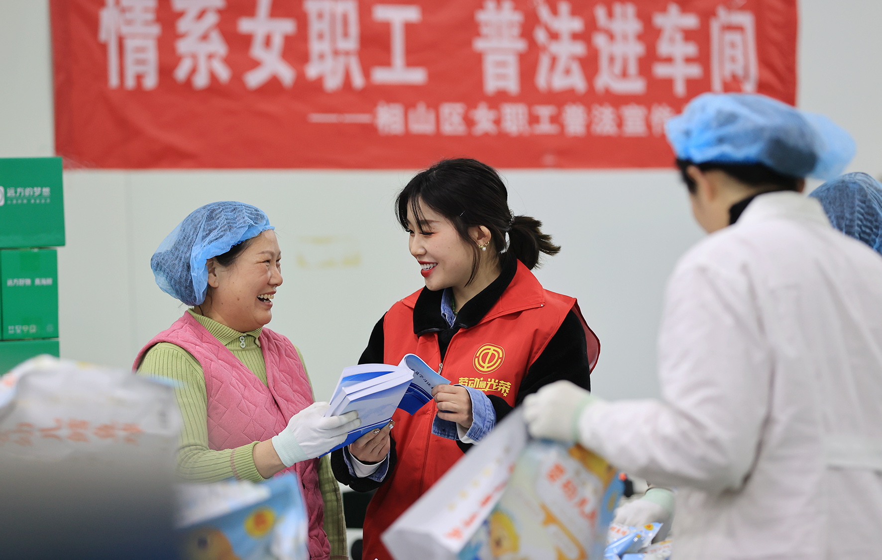 3月6日,安徽省淮北市相山區(qū)總工會普法志愿者在企業(yè)車間內,向女職工宣傳法律知識和企業(yè)安全生產知識。