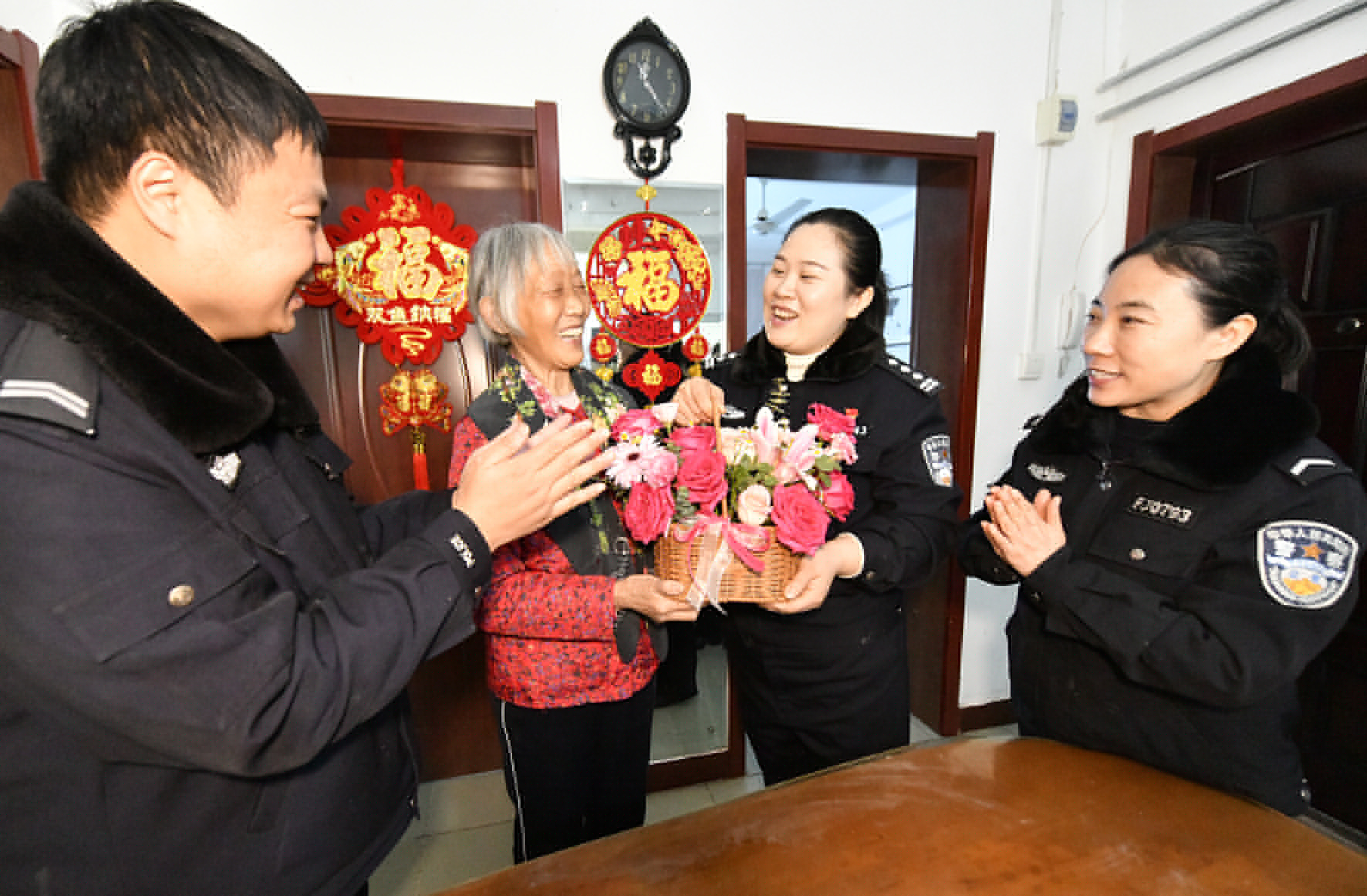 3月7日,河南省鄭州市公安局金水分局巡特警與人民路派出所的民輔警看望81歲的治安先進個人吳大媽,并送上節(jié)日的問候。