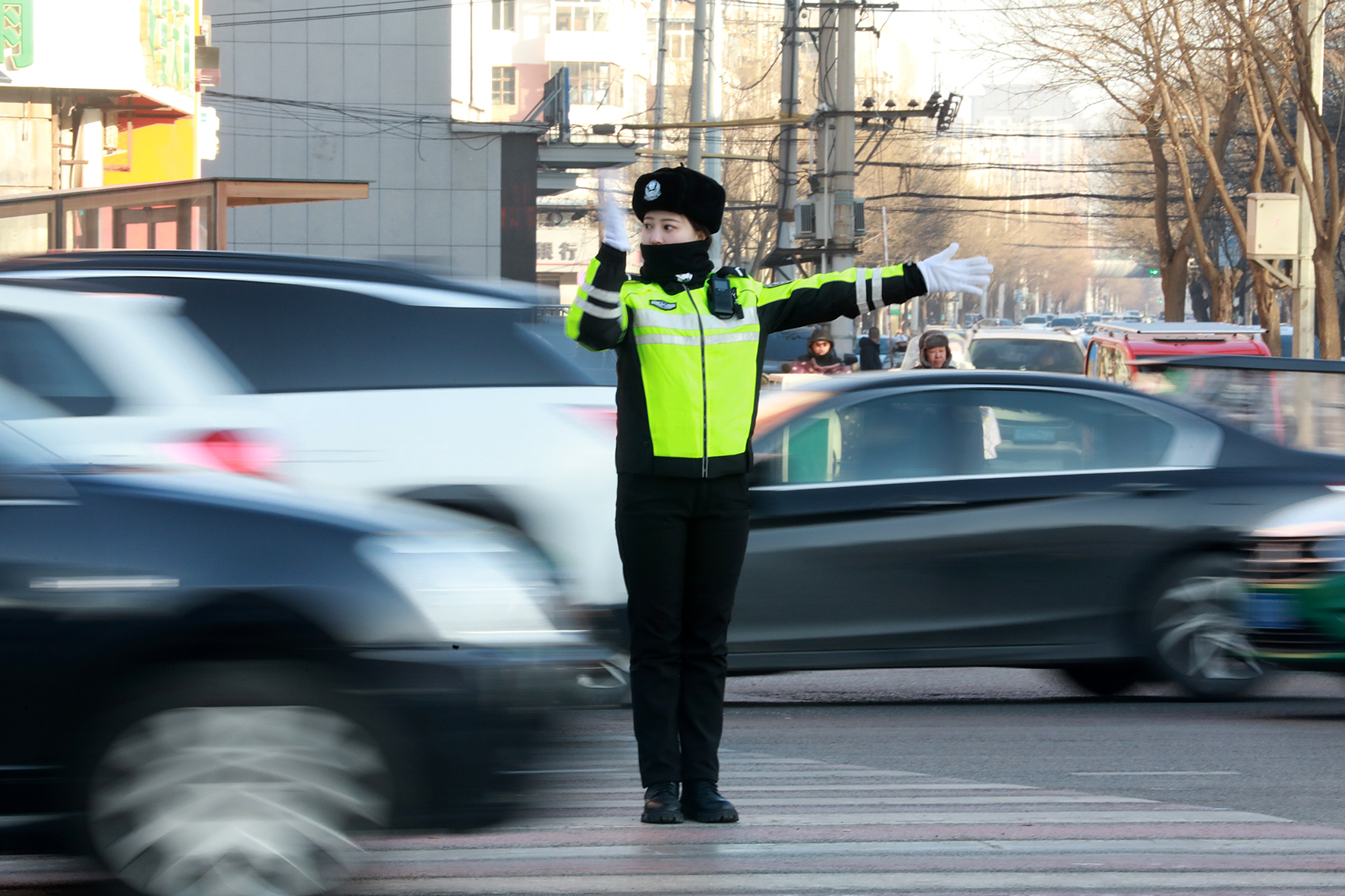 3月7日,遼寧省阜新市公安局交警支隊女民警堅守崗位,迎接“三八”國際婦女節(jié)。