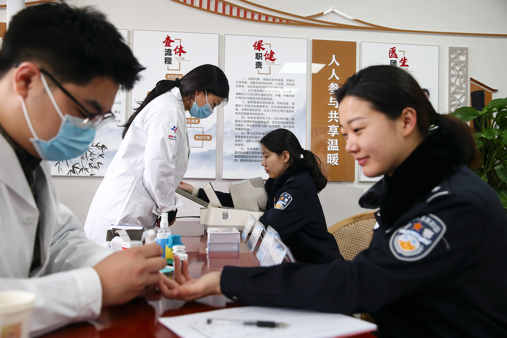 3月7日,山東省濟南市公安局市中區(qū)分局組織“義診服務”活動,邀請醫(yī)務人員走進警營為女民警提供查體和保健服務。