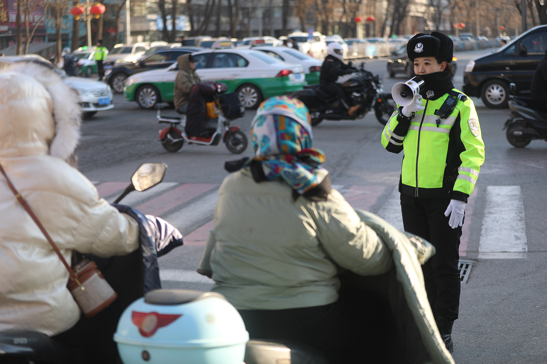 3月12日早高峰時(shí)段,遼寧省阜新市公安局交通警察支隊(duì)海州大隊(duì)民警輔警在花園崗路口對(duì)騎電動(dòng)自行車(chē)沒(méi)有佩戴頭盔的市民進(jìn)行勸導(dǎo)。