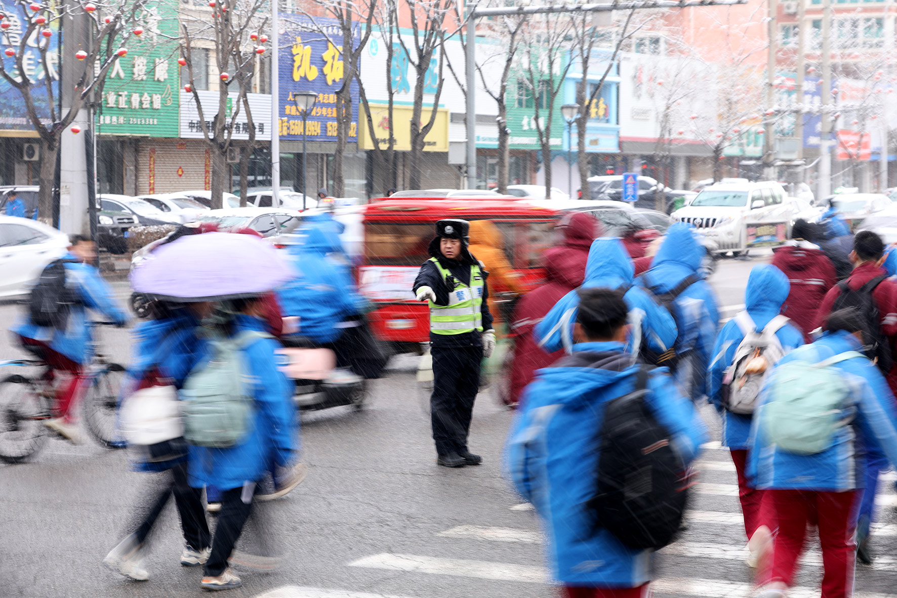 3月19日,遼寧省阜新市突降小雪。阜新市公安局交通警察支隊細河大隊民輔警頂風冒雪,站好“護學崗”。