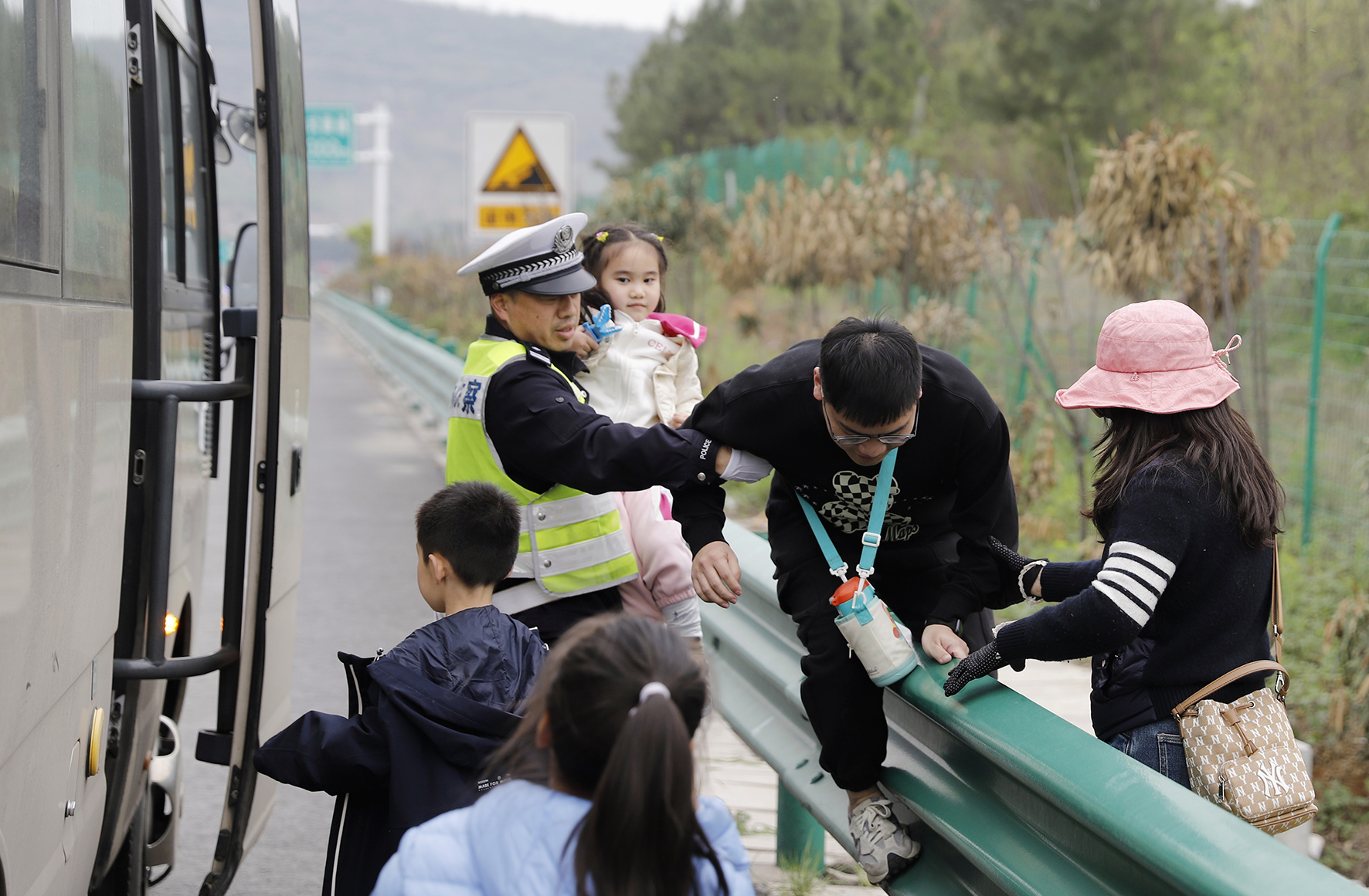 4月4日,安徽省蕪湖市公安局交警支隊高速三大隊民警在合蕪高速福山服務區(qū)附近路段,協(xié)助轉(zhuǎn)運故障車乘客。