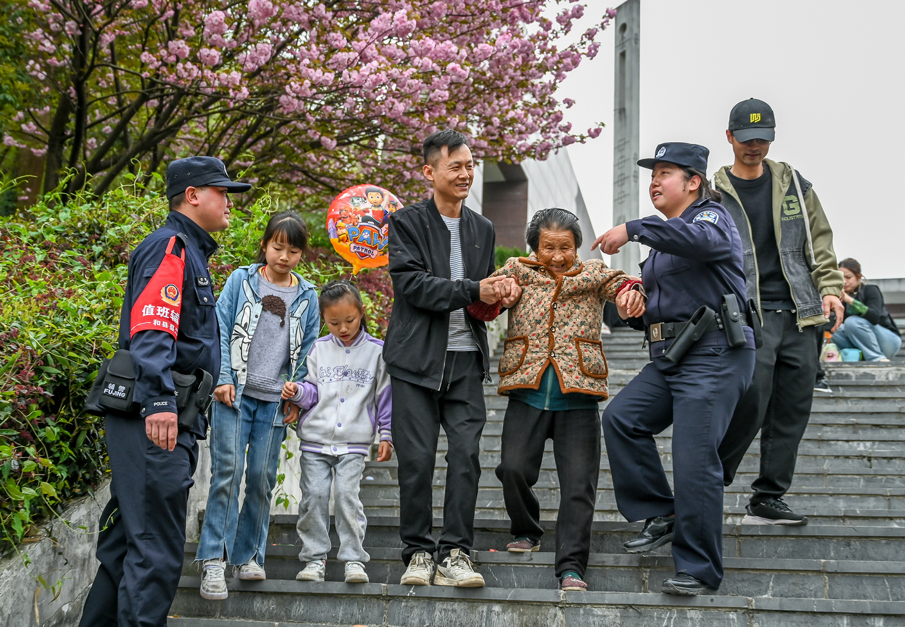 4月5日,安徽省馬鞍山市和縣公安局民警在西梁山革命烈士紀念館前幫助出行不便的群眾。