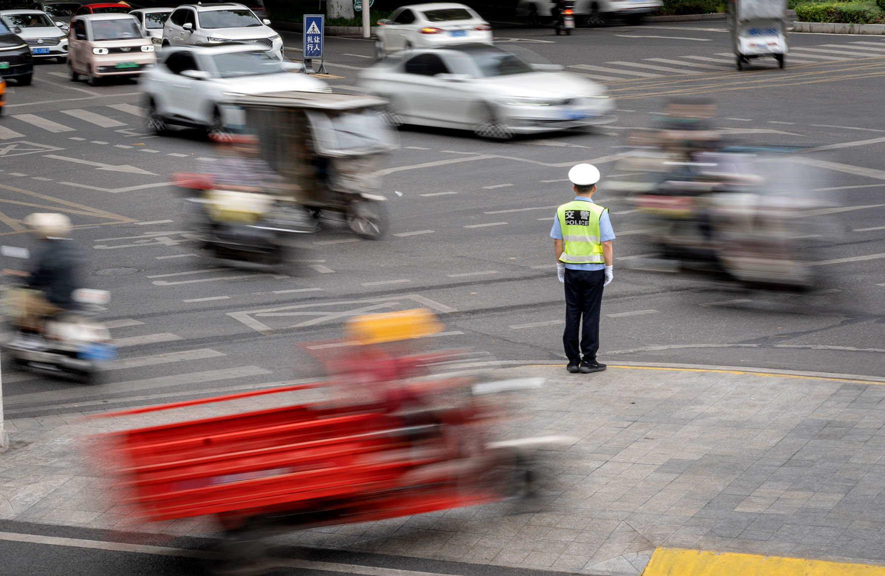 5月1日,四川省綿陽市公安局交警支隊民警在涪城區(qū)東方紅大橋十字路口執(zhí)勤疏導(dǎo)交通。