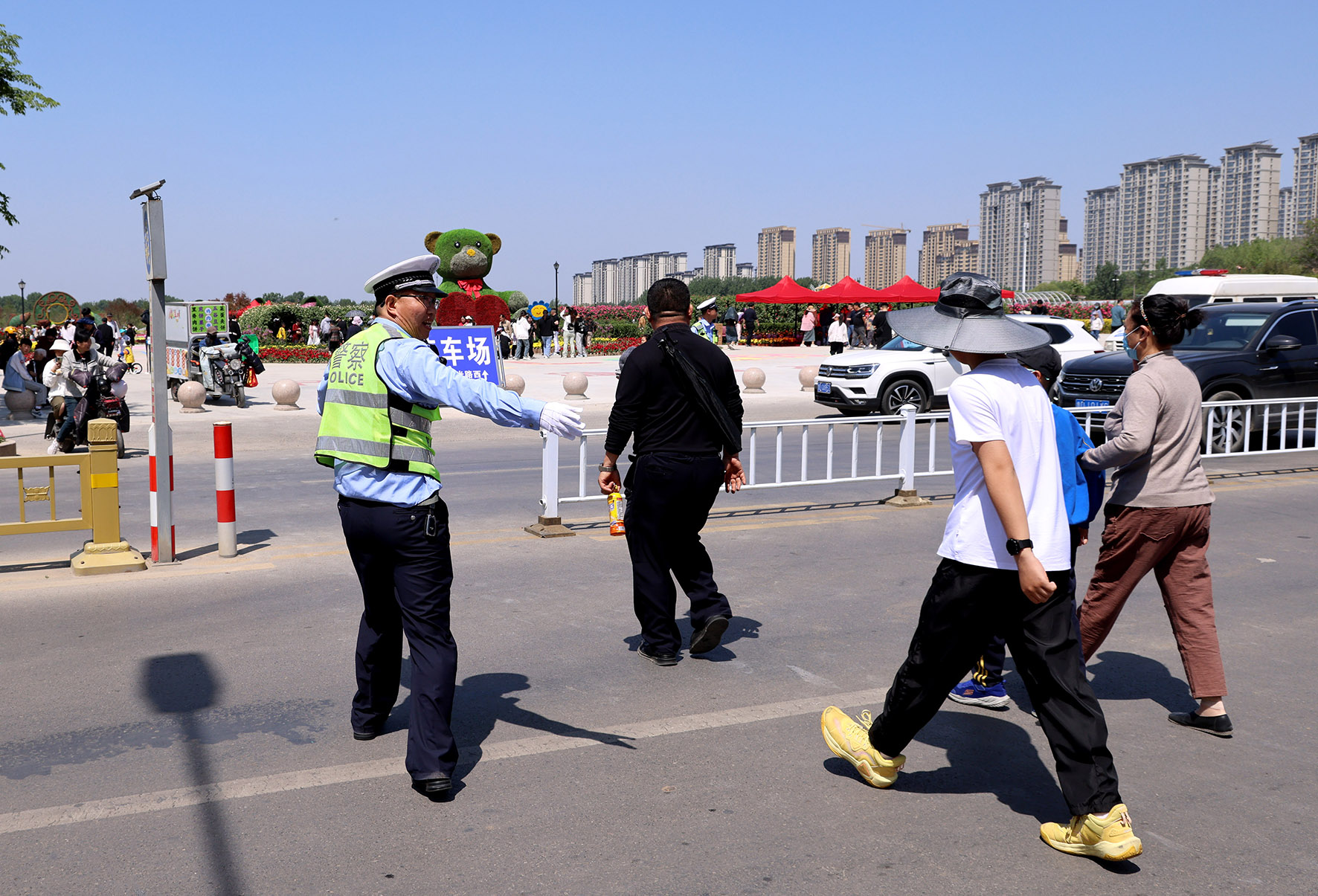 5月1日,山東省棗莊市公安局市中分局交通警察大隊民警在一處景點出入口疏導(dǎo)交通。