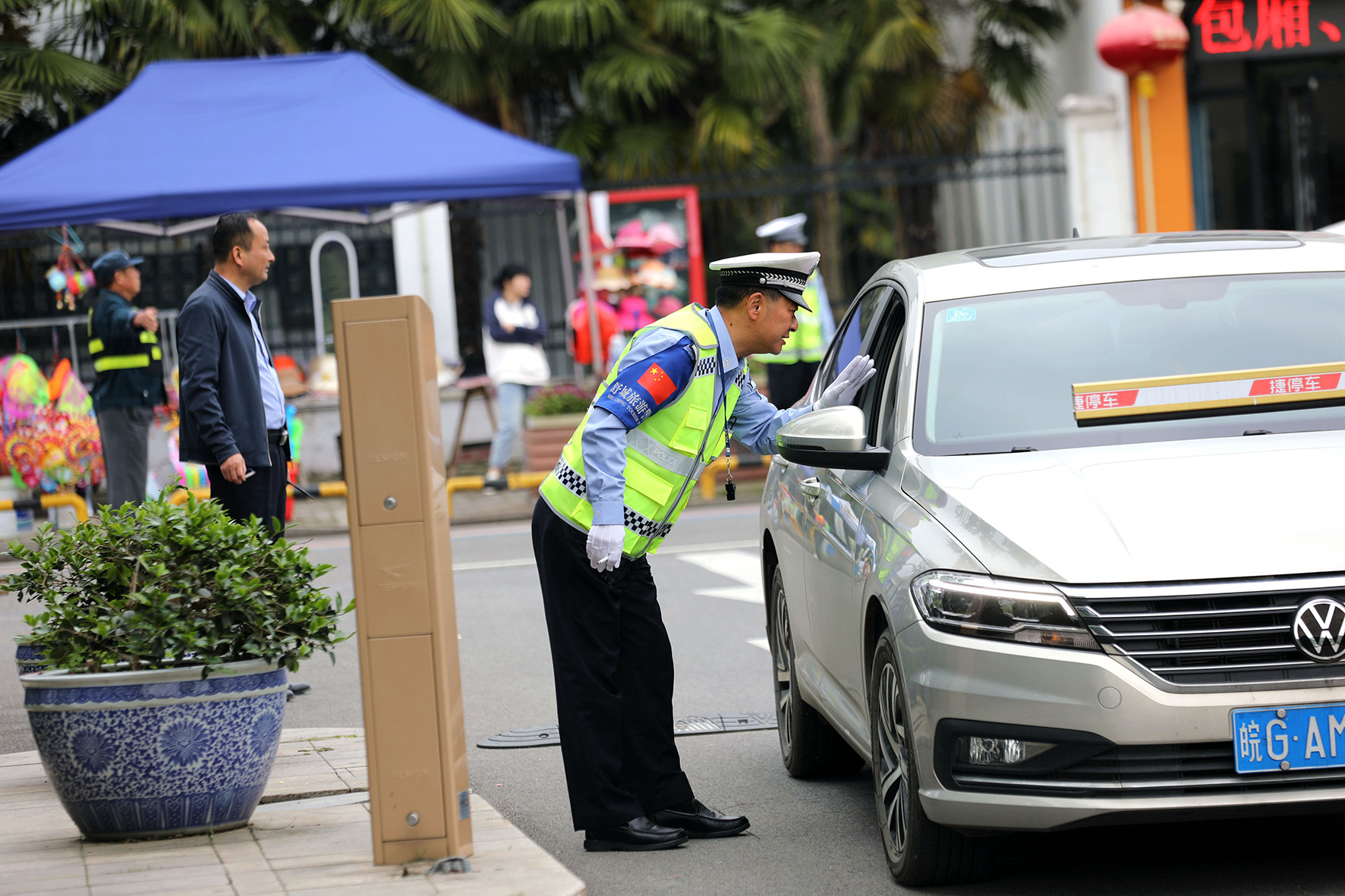 5月2日,安徽省舒城縣公安局旅游警察大隊民警輔警在游客較為集中的景點巡邏守護(hù)、疏導(dǎo)交通、為游客提供服務(wù)。