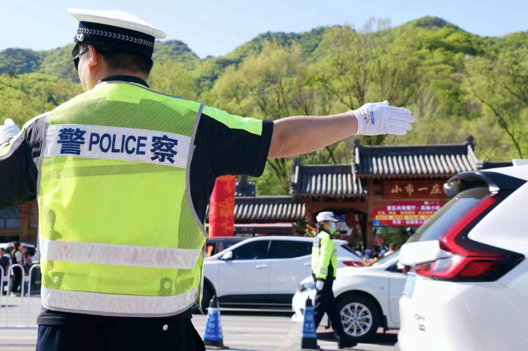 5月2日,遼寧省本溪滿族自治縣公安局交通管理大隊民輔警在景區(qū)道路上執(zhí)勤,疏導(dǎo)行人和車輛。
