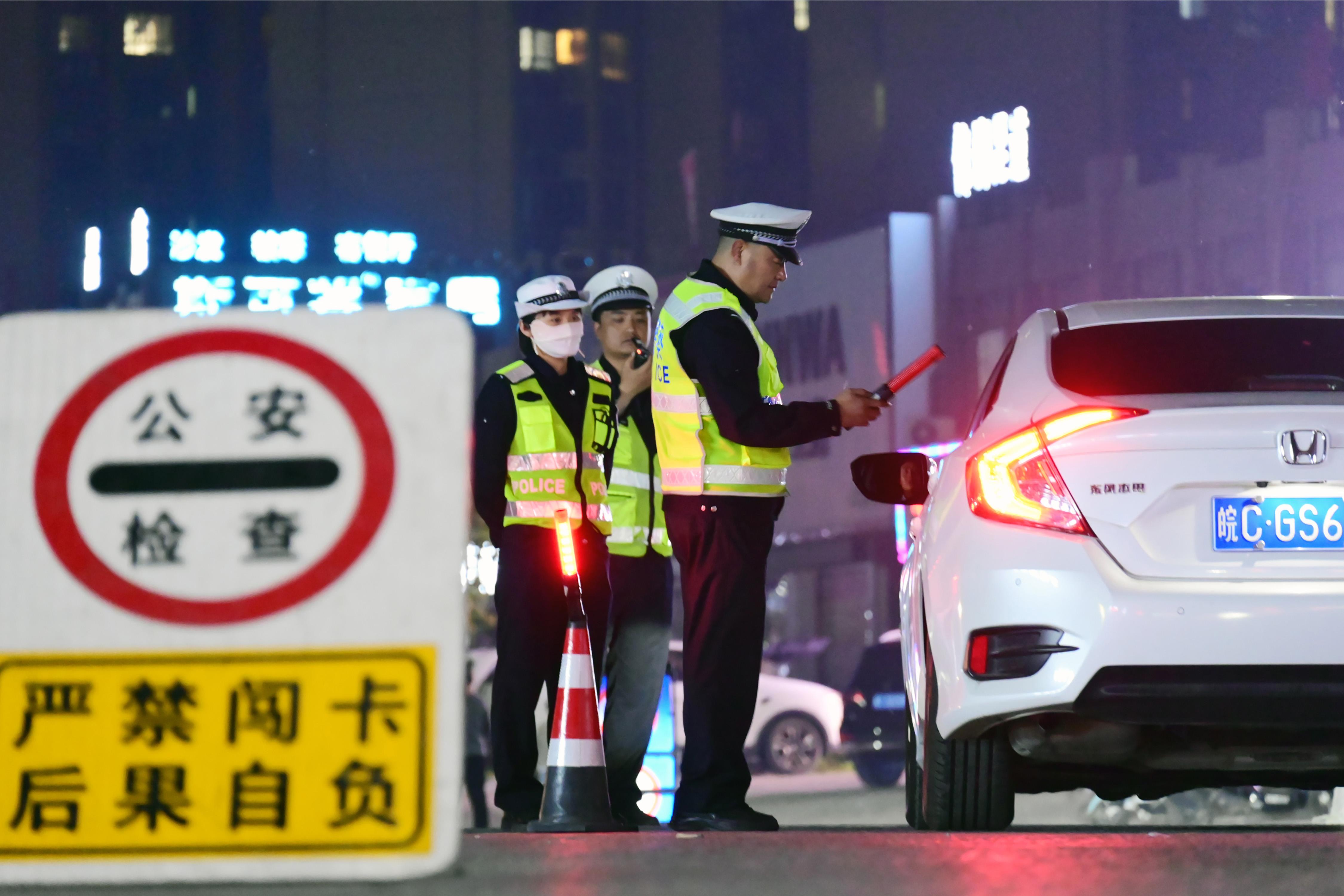 5月5日,安徽省固鎮(zhèn)縣公安局交管大隊民輔警在立新路夜查酒駕違法行為。