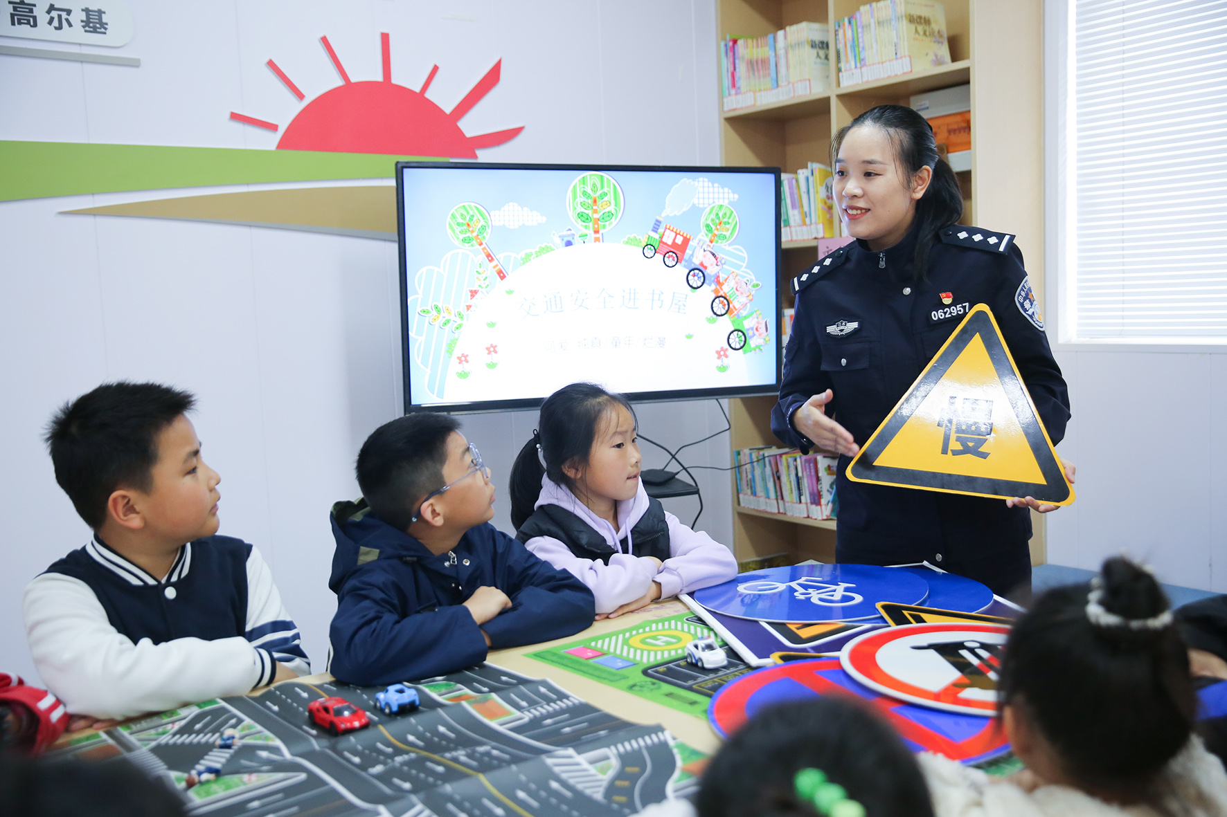5月5日,江蘇省如皋市城南街道馬塘社區(qū)農(nóng)家書屋假期交通安全課堂上,高新區(qū)交警中隊民警向?qū)W生交通安全知識普及。