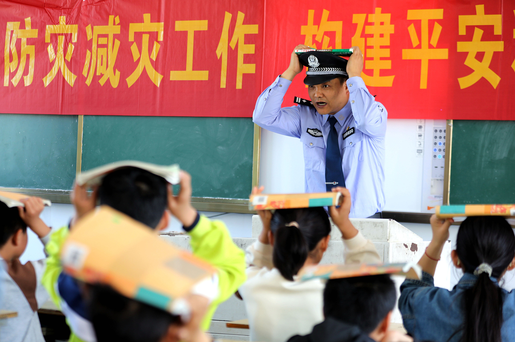 5月10日,安徽省舒城縣公安局闕店派出所民警在課堂上向學生講解防災減災相關知識。