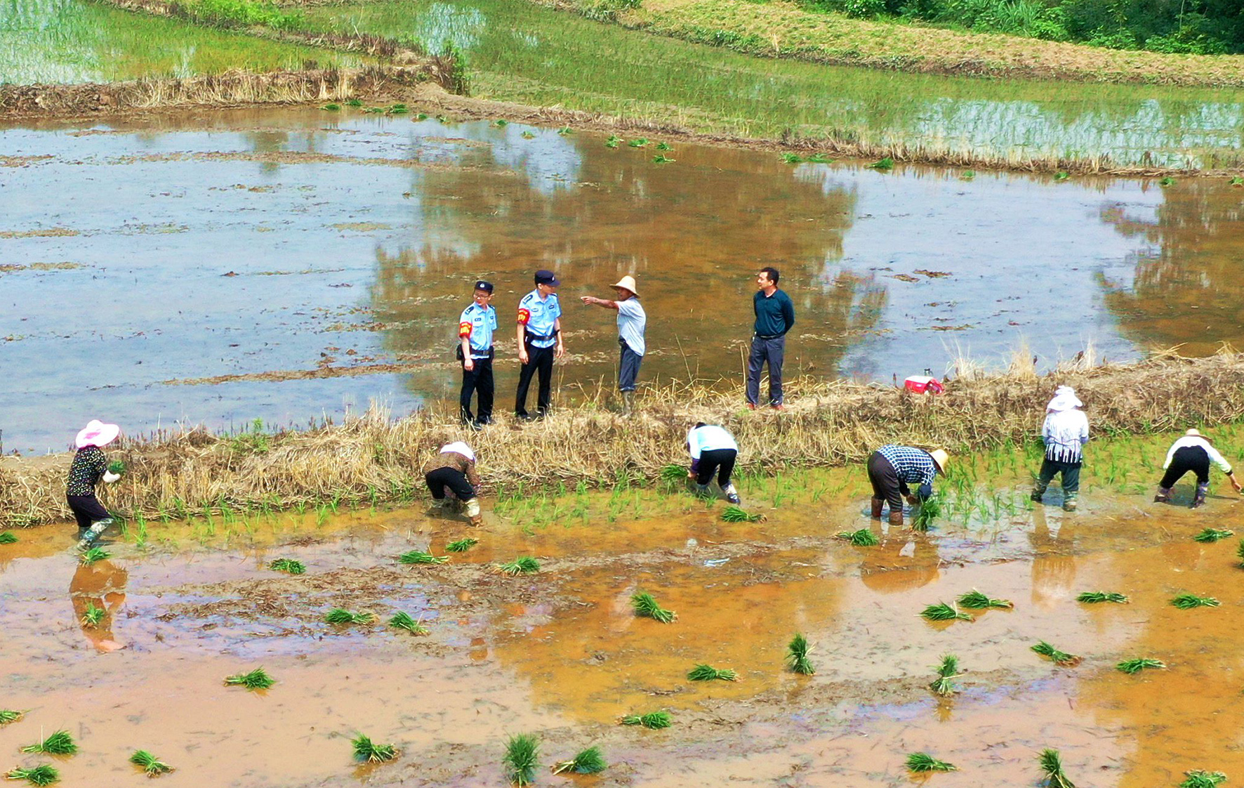 6月7日,安徽省舒城縣公安局張母橋派出所民警深入轄區(qū)農(nóng)林村田間,與栽種水稻秧苗的村民交流了解治安情況?!叭摹睍r節(jié),張母橋派出所民警以“田間警務(wù)”為著力點,深入田間地頭,開展巡邏、防范盜竊、現(xiàn)場化解糾紛等工作,為農(nóng)忙保駕護航。