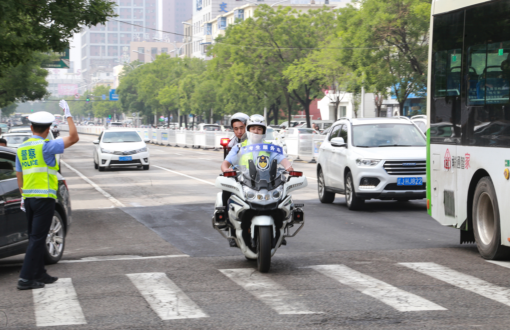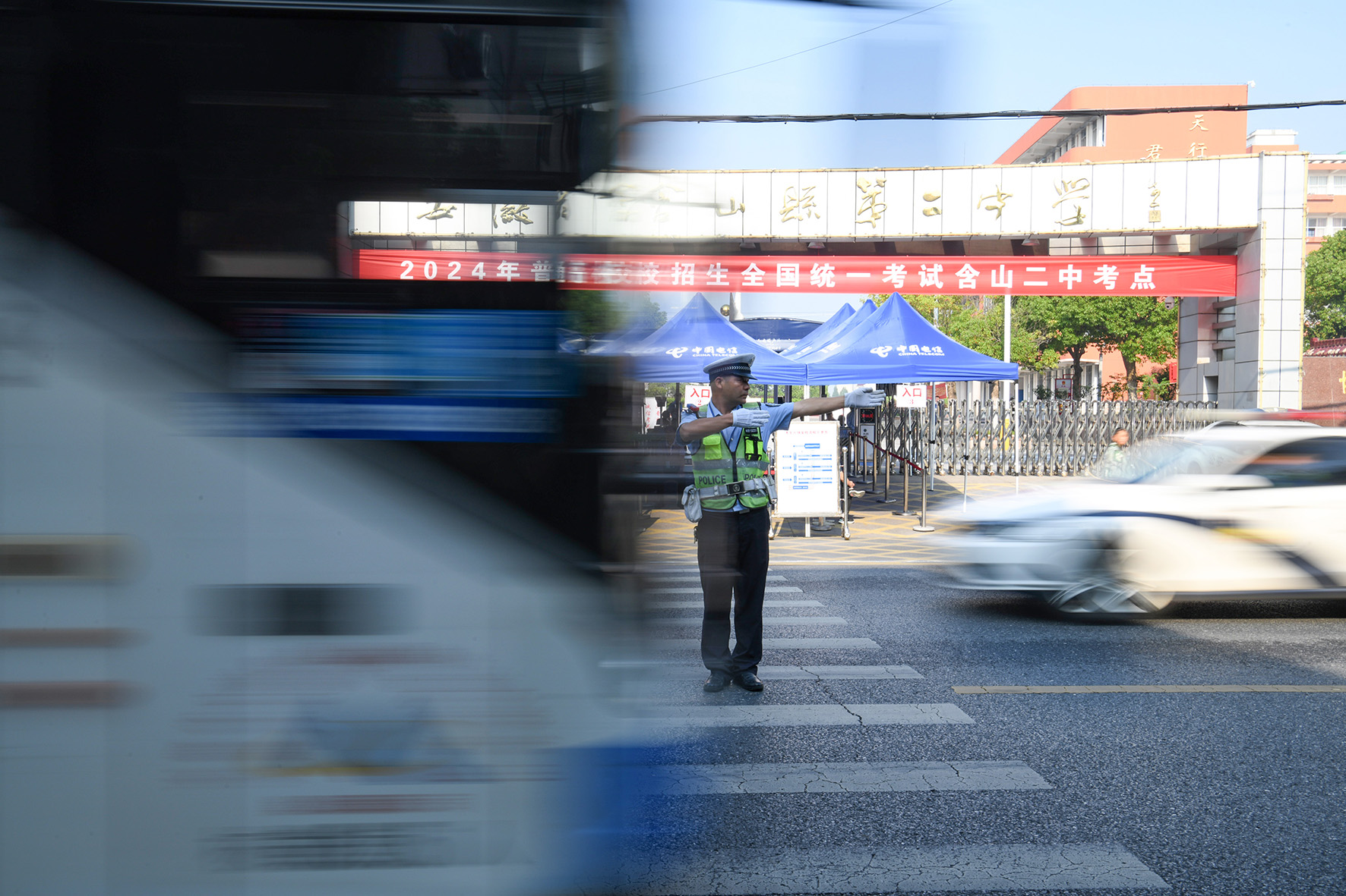 6月8日,江西省九江市公安局交管支隊第一大隊民警在九江三中考點門前路段執(zhí)勤疏導(dǎo)指揮交通。
